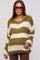A knit striped maternity sweater featuring long sleeves and a rounded neckline.
