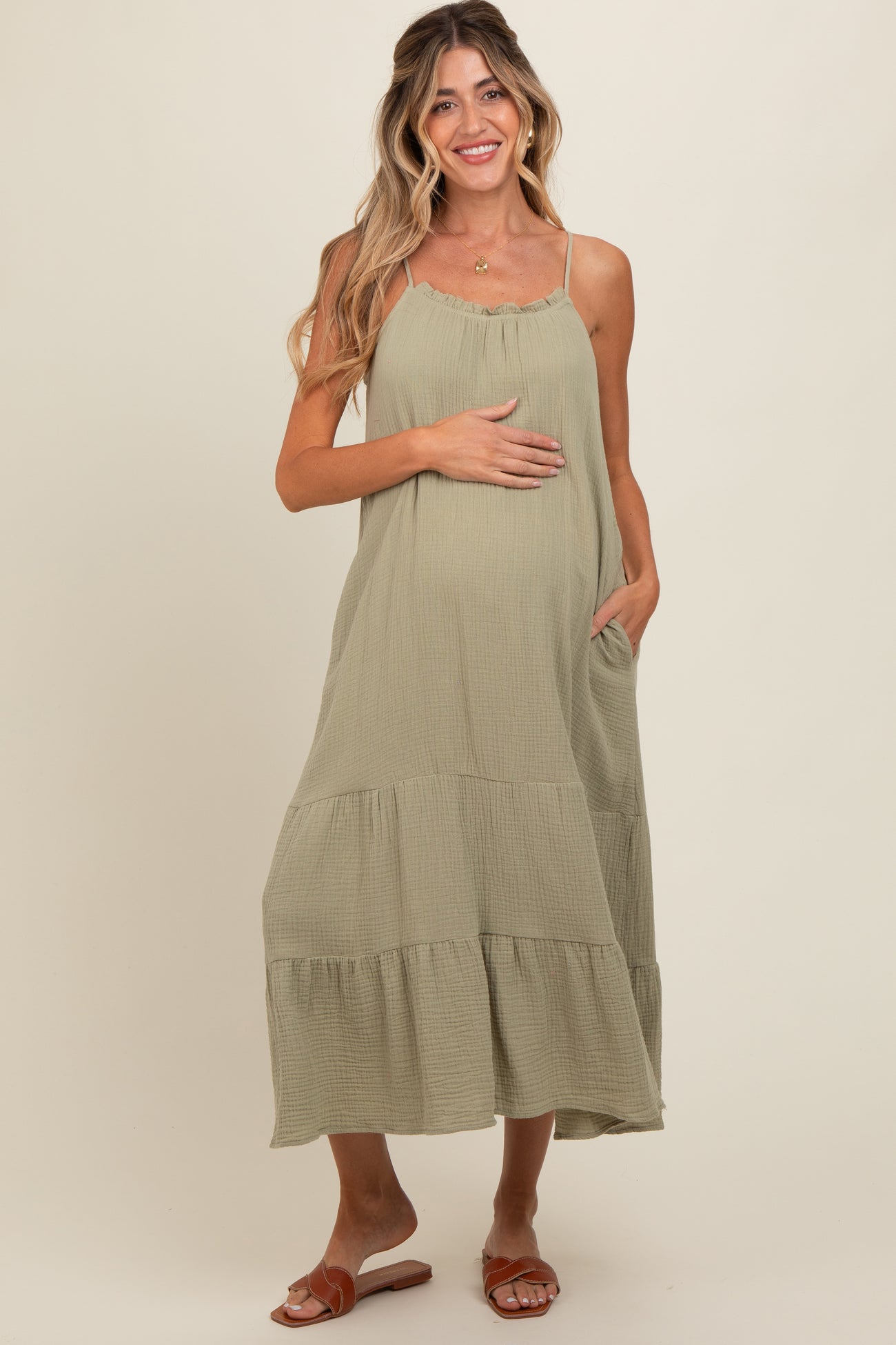 Olive Tiered Hem Maternity Midi Dress