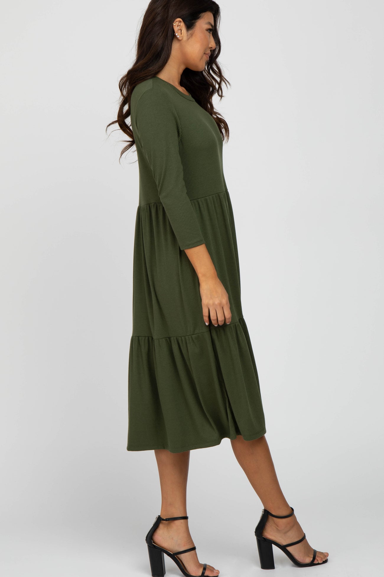 Olive Tiered Ribbed 3/4 Sleeve Midi Dress