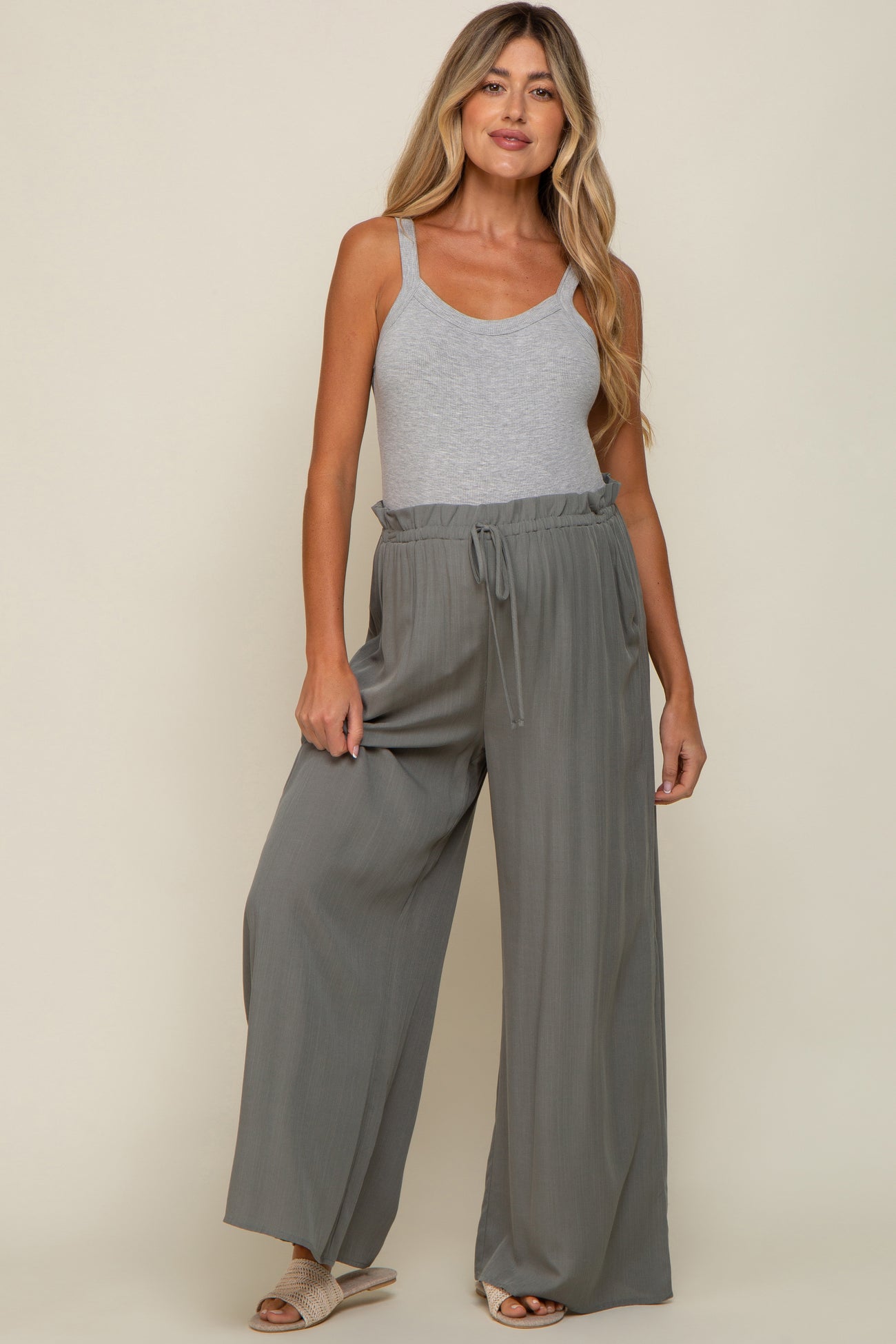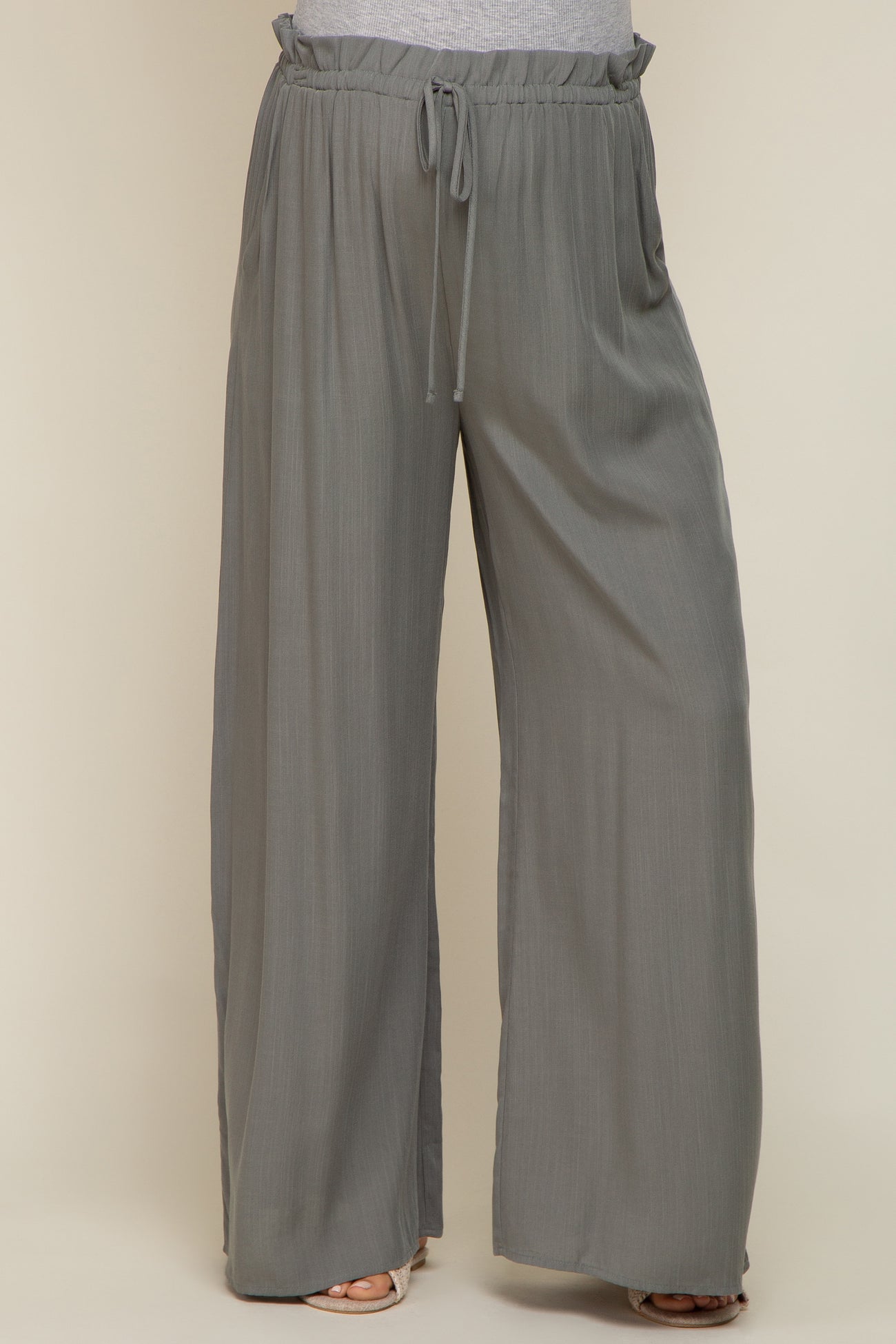 Details A pair of solid hued maternity pants featuring wide legs, side pockets and a drawstring ruffle waistband. Content + Care
