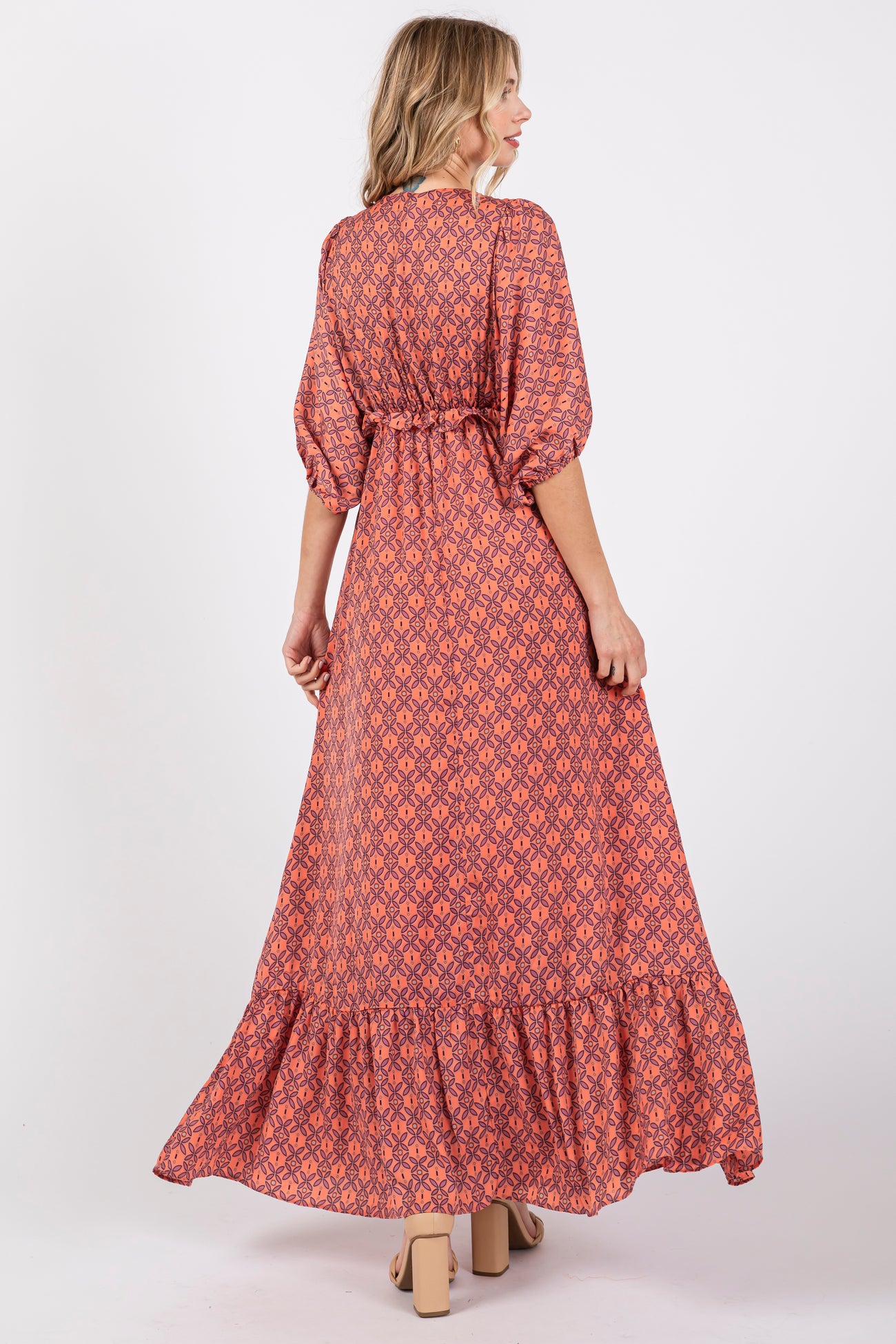 Orange Deep V-Neck Short Puff Sleeve Ruffle Maxi Dress