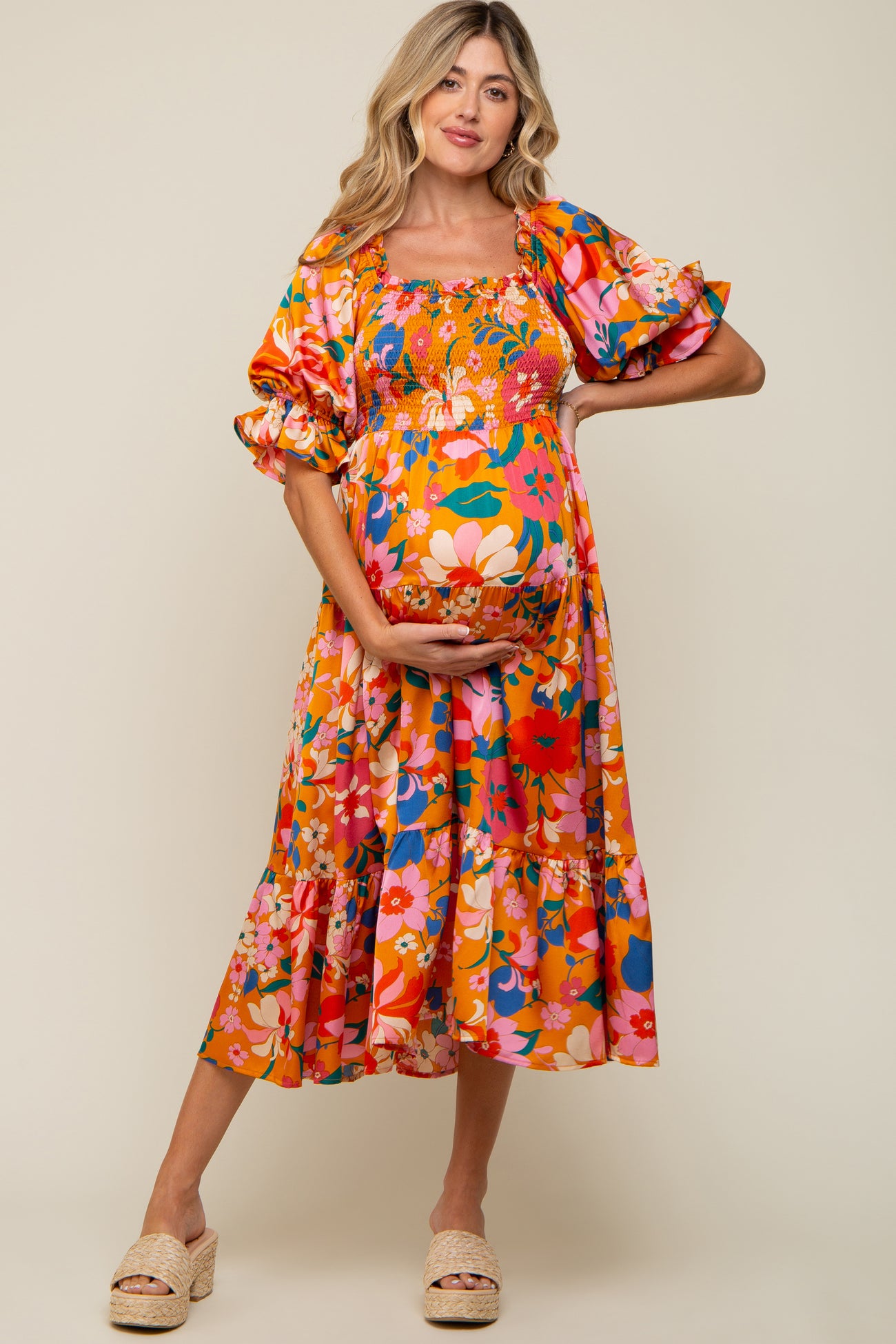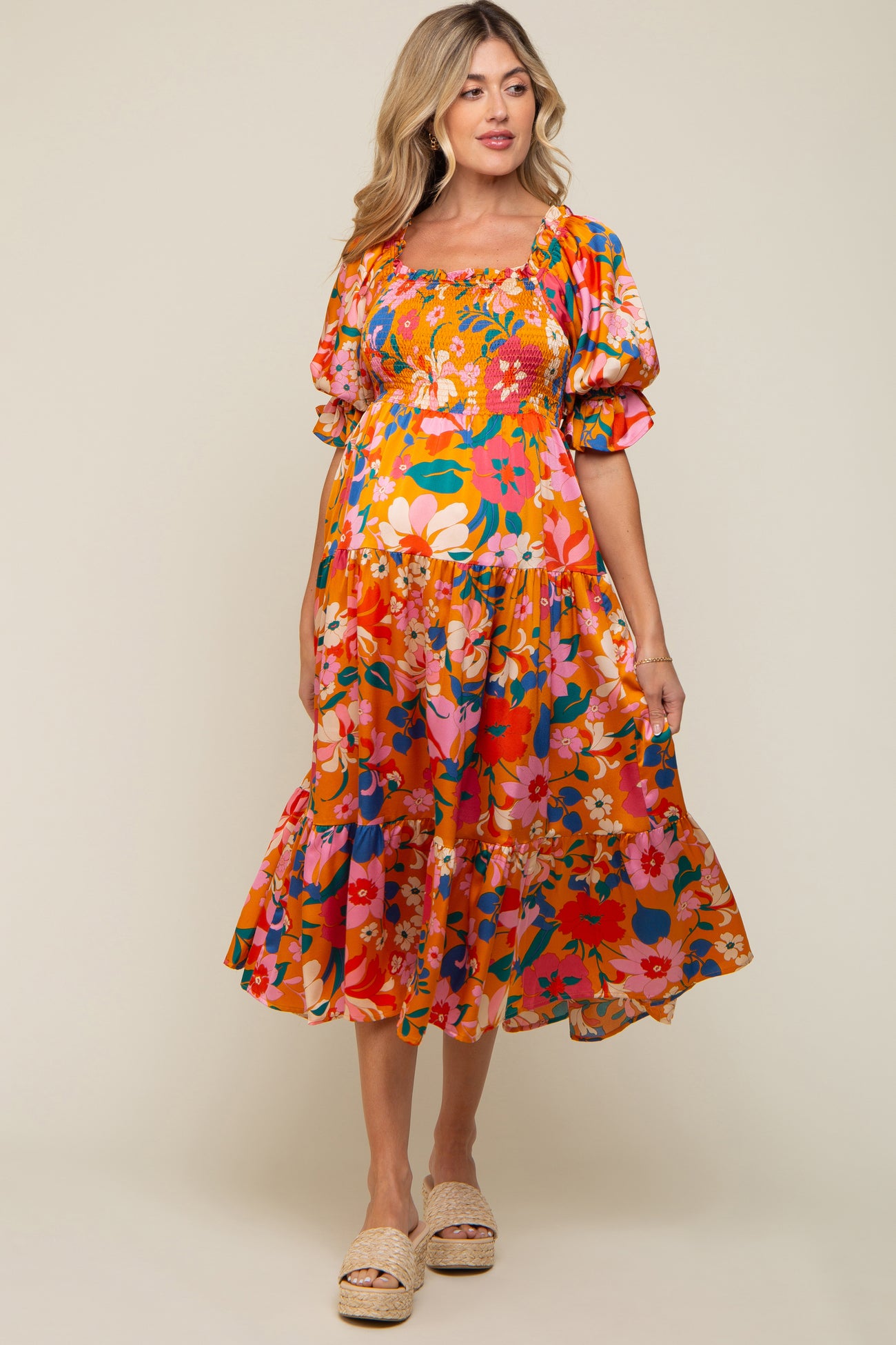 Orange Floral Satin Smocked Short Sleeve Maternity Midi Dress