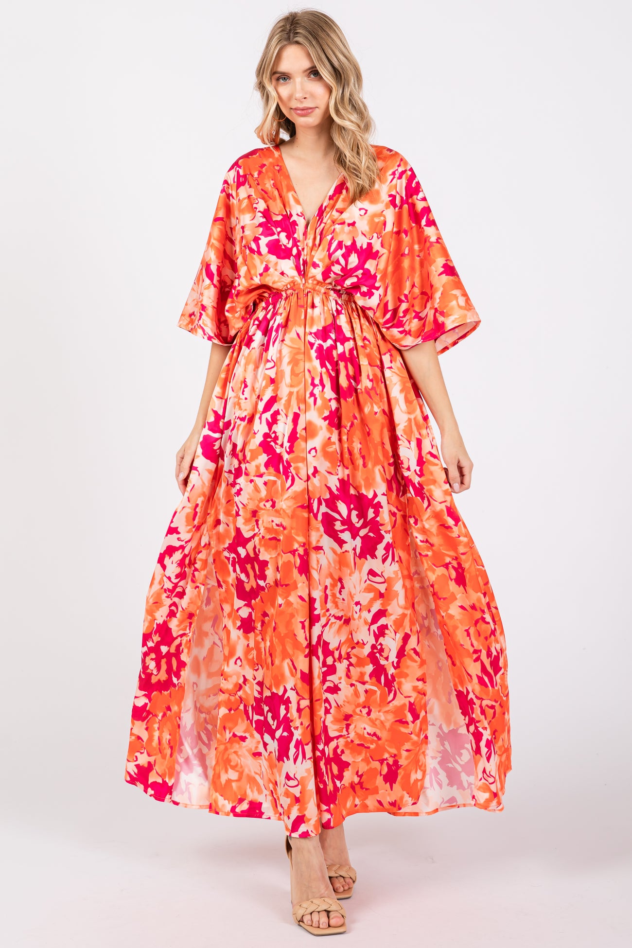 Orange Floral Satin V-Neck Maternity Maxi Dress