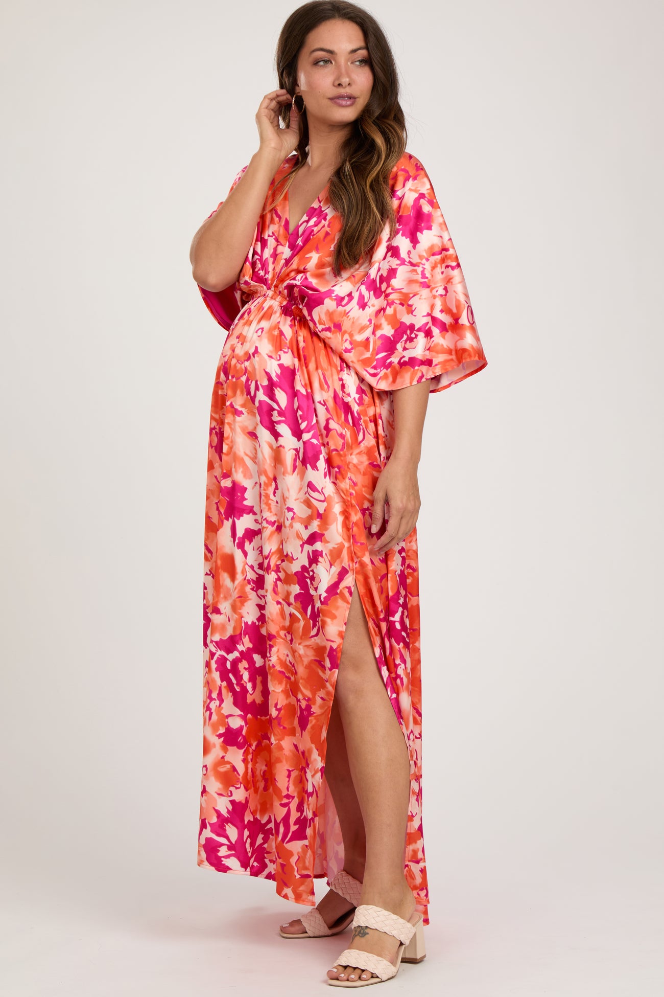 A satin floral maternity maxi dress featuring a v-neckline, short dolman sleeves, an elastic waist, and two front slits.
