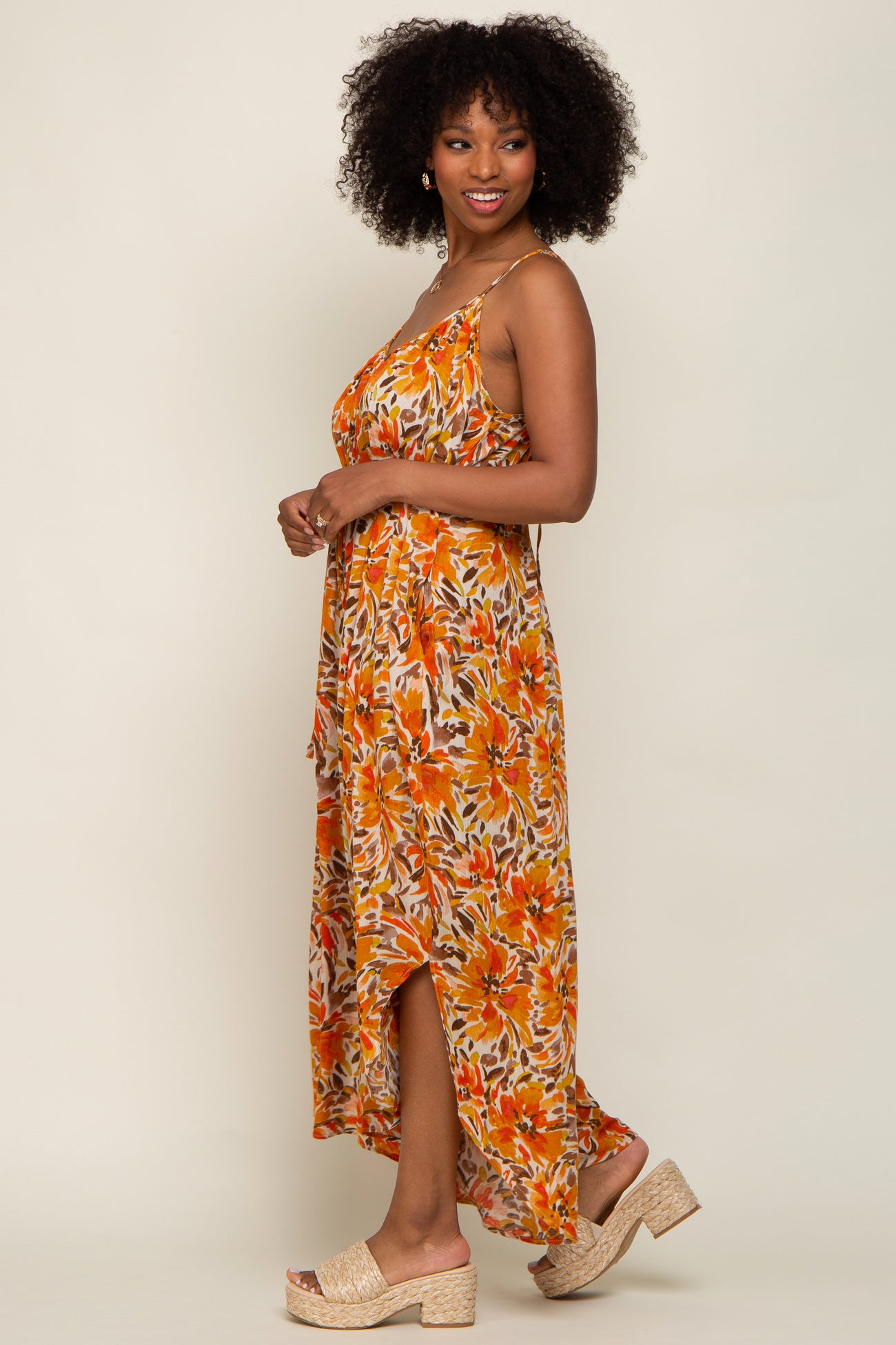A multi-color floral sleeveless jumpsuit featuring adjustable cami straps, side pockets, wide legs and a v-neckline.