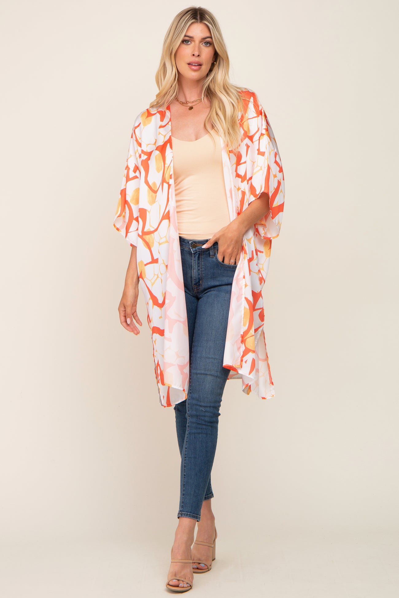 A printed maternity coverup with half-length dolman sleeves, an open front, side slits, and a hi-lo hem.