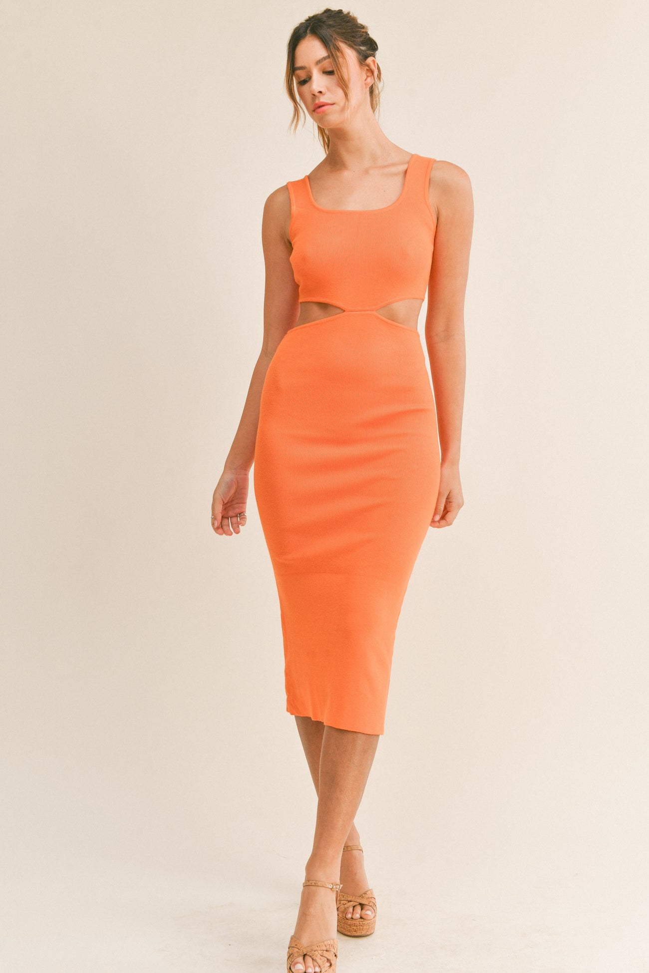 Details A solid knit midi dress with a scoop neckline and side cutouts. Content + Care