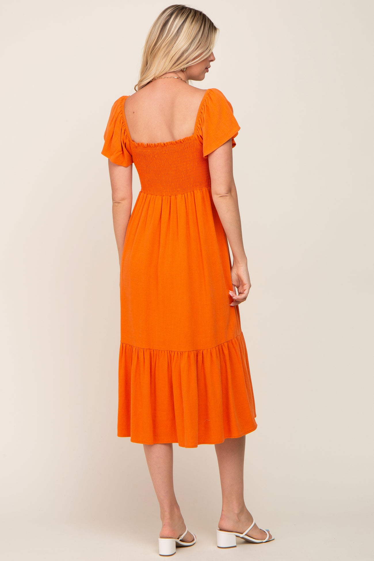 A solid midi dress featuring short flutter sleeves, a smocked top, a ruffle hem and a square neckline.