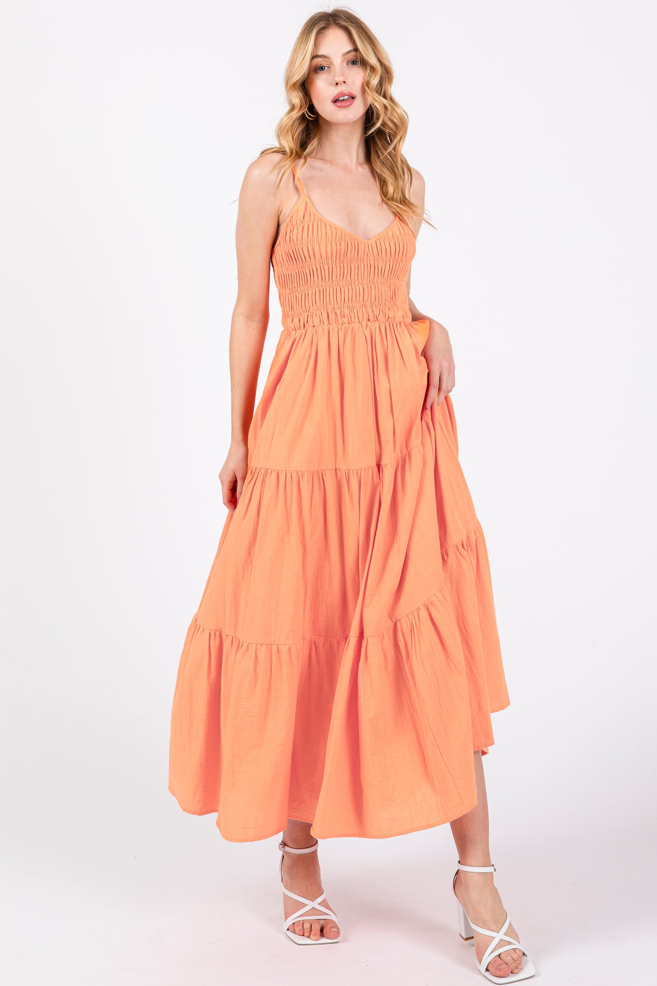 Orange Smocked V-Neck Sleeveless Tiered Midi Dress