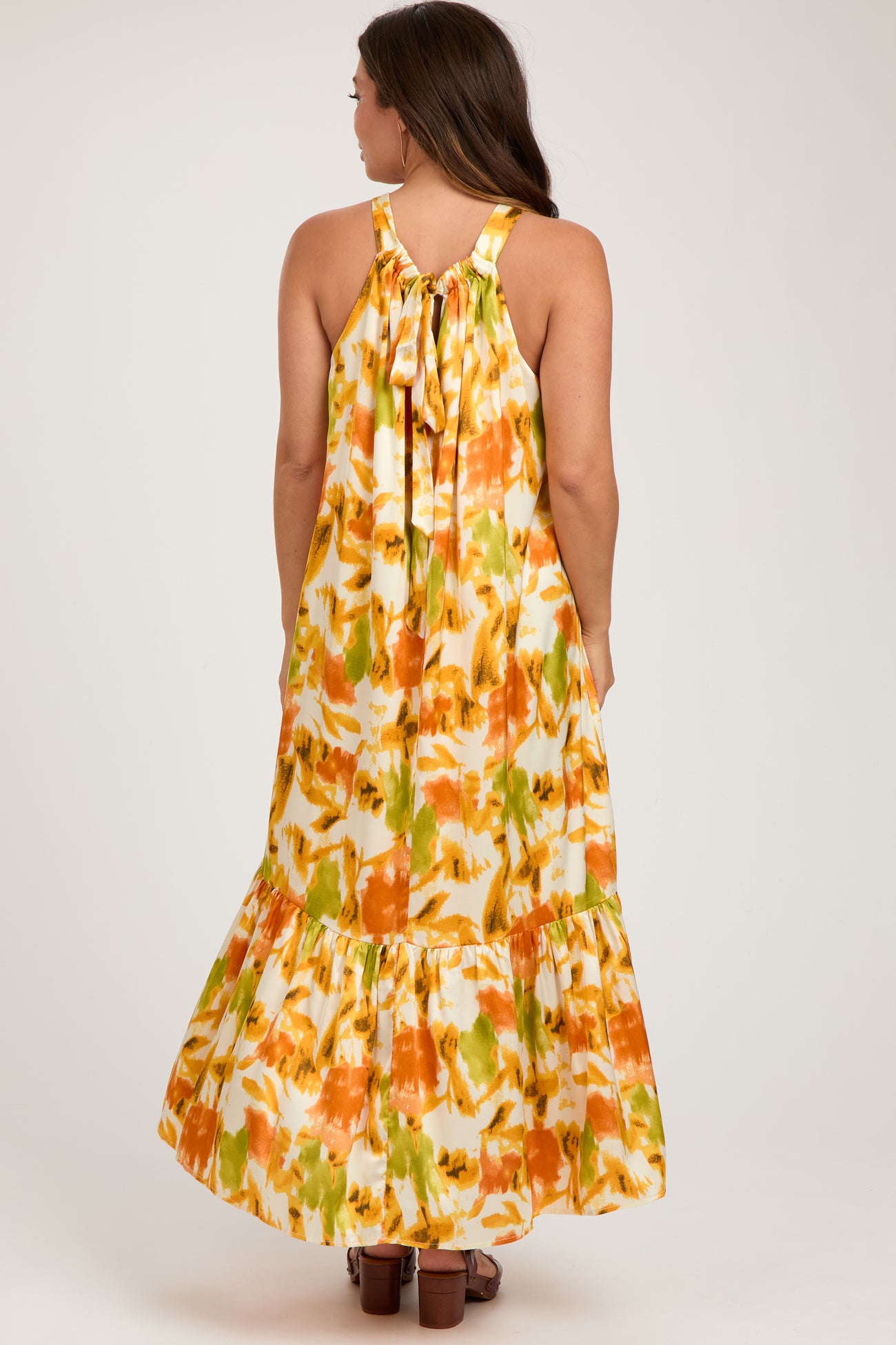 A printed maternity midi dress with a halter back tie neckline and a gathered bottom tier. Dress is lined 3/4 of the way down.