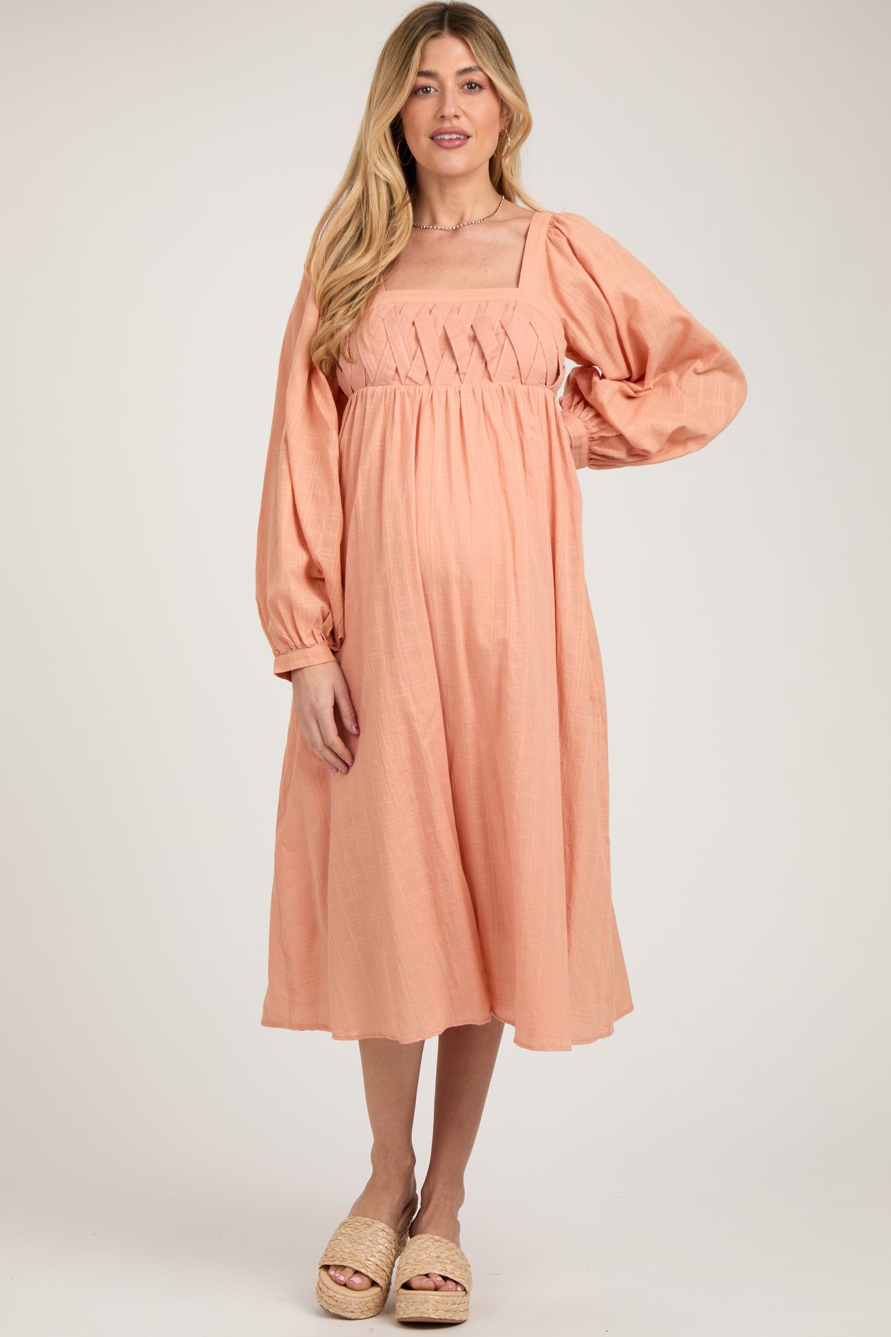 Peach Criss Cross Front Square Neck Long Sleeve Maternity Midi Dress