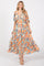 A floral print maxi dress featuring a v-neckline with a hook and eye closure, short dolman sleeves, a back elastic waist, and a tiered skirt. Skirt is partially lined.
