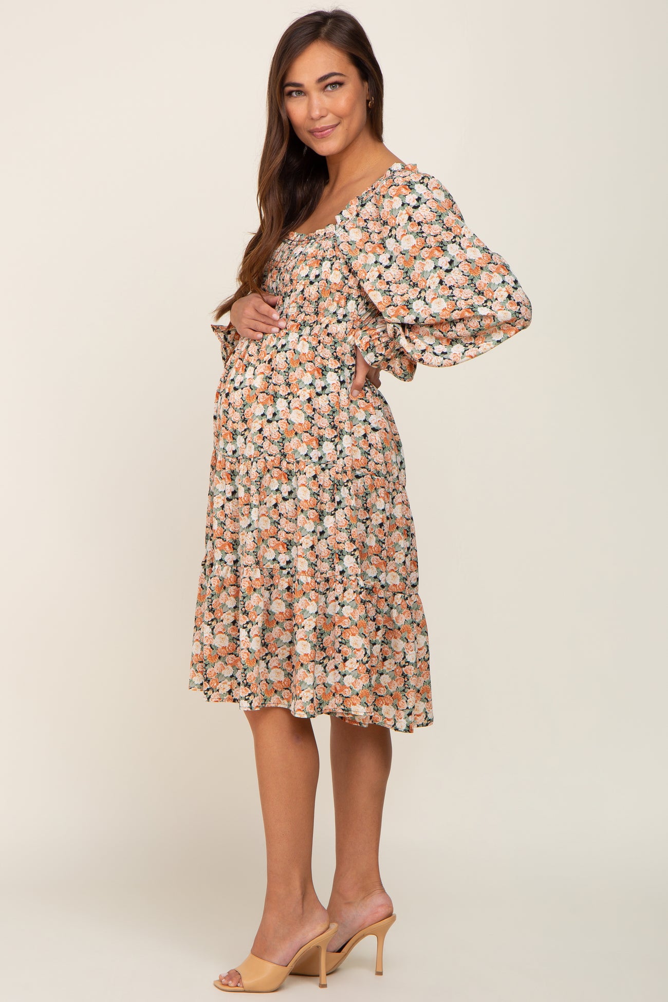 Peach Floral Smocked Square Neck Tiered Maternity Dress