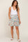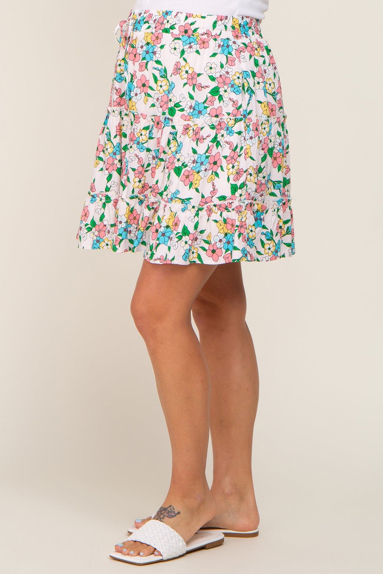 A floral print maternity mini skirt with an elastic waistband, a drawstring waist tie, side pockets and gathered tiers. Skirt is lined.