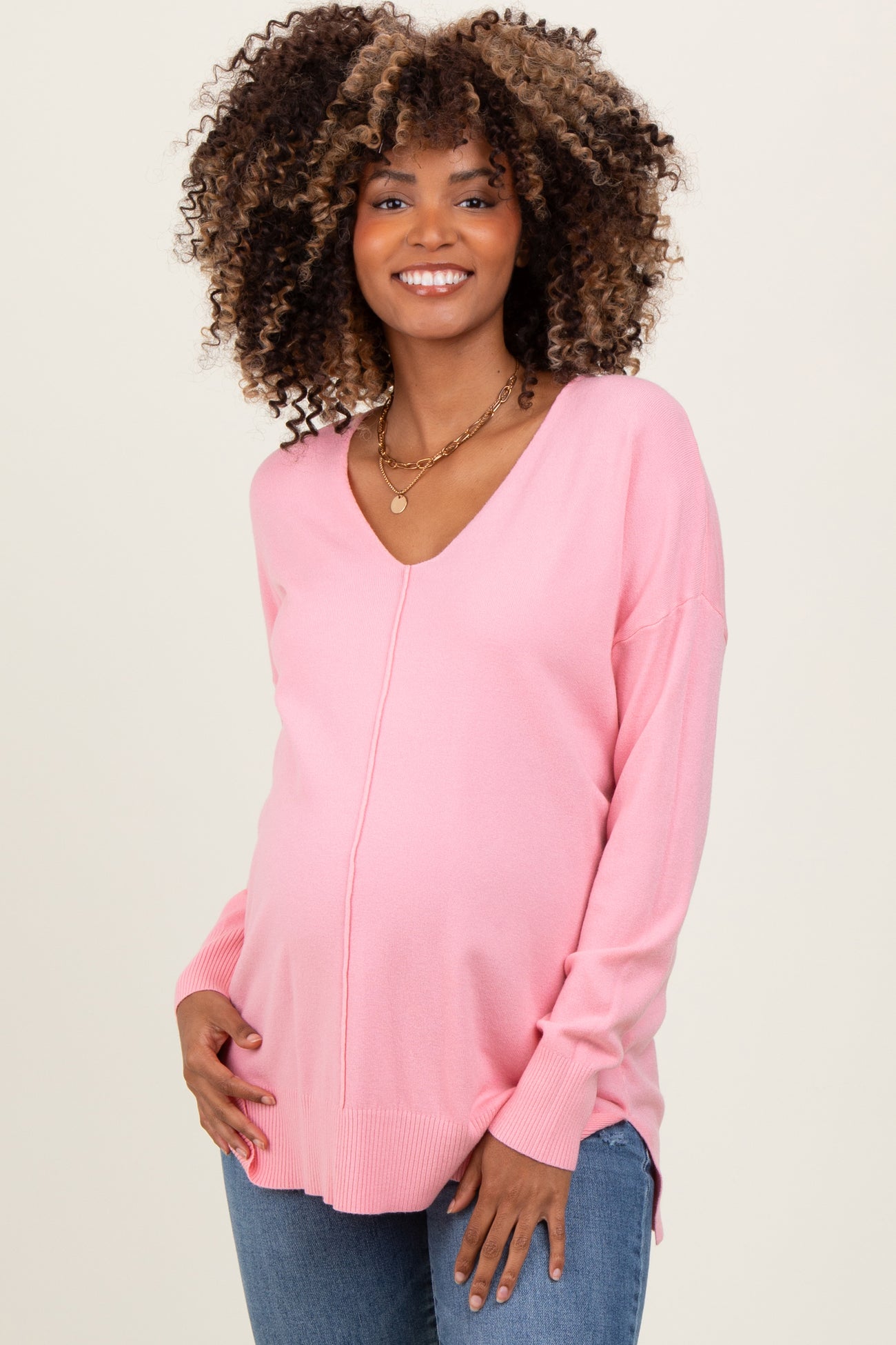 Peach Front Seam V-Neck Side Slit Maternity Sweater