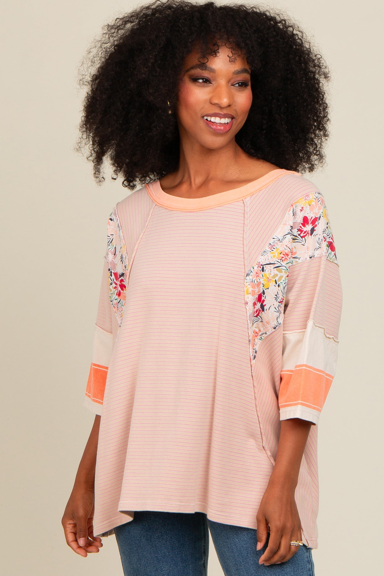 Peach Mixed Print Dolman Sleeve Top