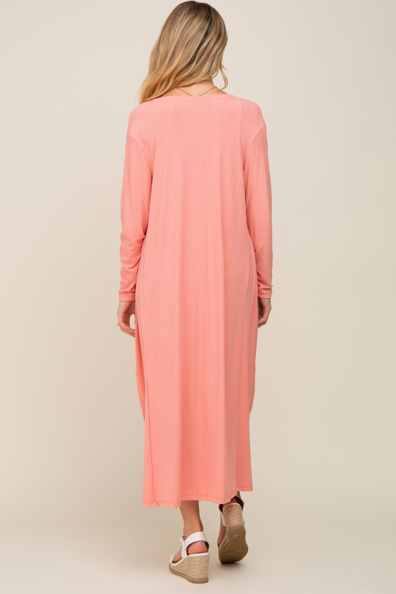 A solid ribbed maternity cardigan and dress two piece set. Dress straps are not adjustable.