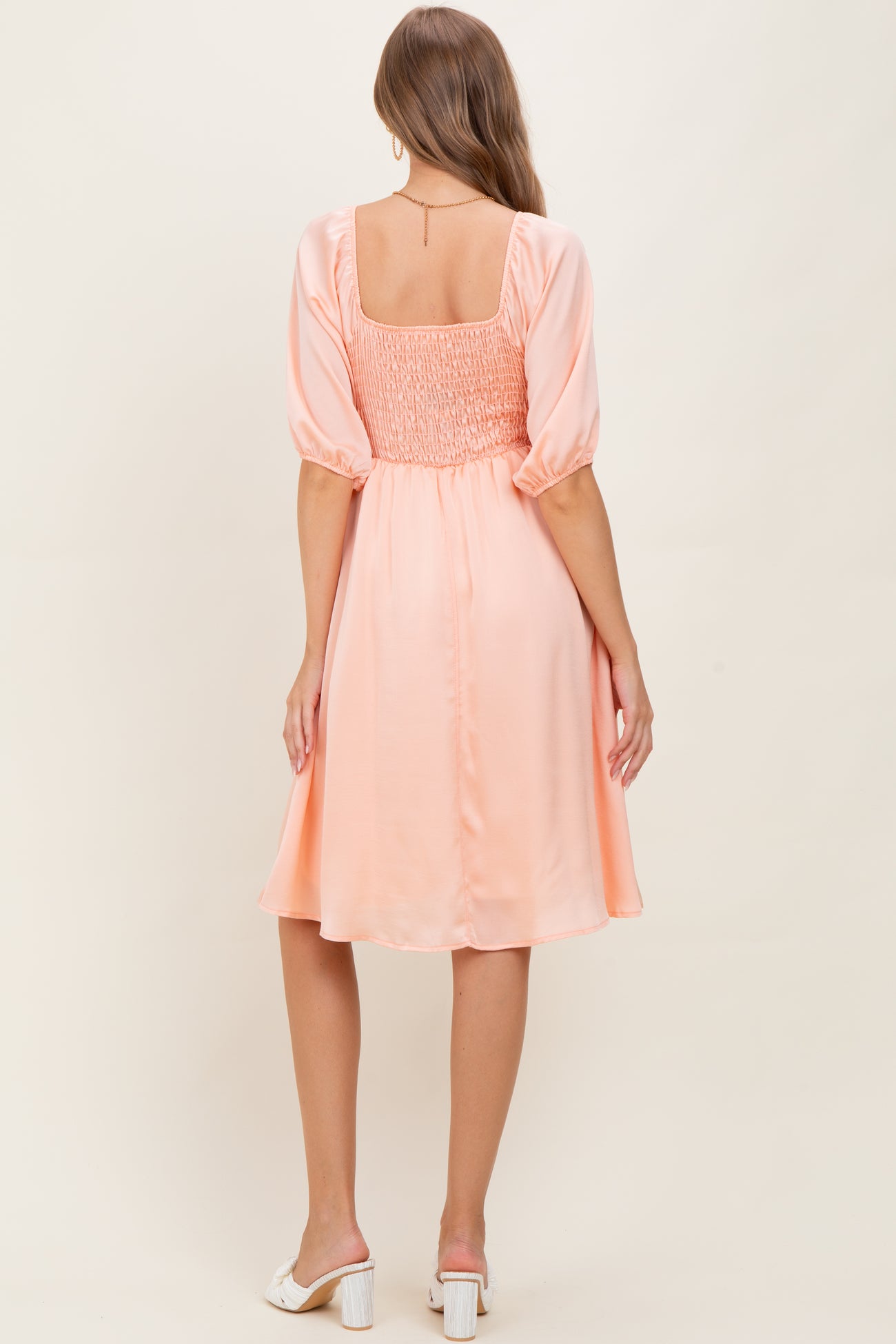 Elevate your maternity wardrobe with our Peach Satin Smocked Maternity Midi Dress. Crafted from silky satin fabric, this dress features a flattering smocked bodice that gently hugs your growing bump for comfortable support. The square neckline and puffed elbow-length sleeves add a touch of elegance, while the flowing midi skirt creates a graceful silhouette. Perfect for special occasions or everyday wear, this dress combines style and comfort seamlessly. Available in a soft peach hue, it’s a beautiful choice to celebrate your pregnancy in style. Machine washable for easy care.