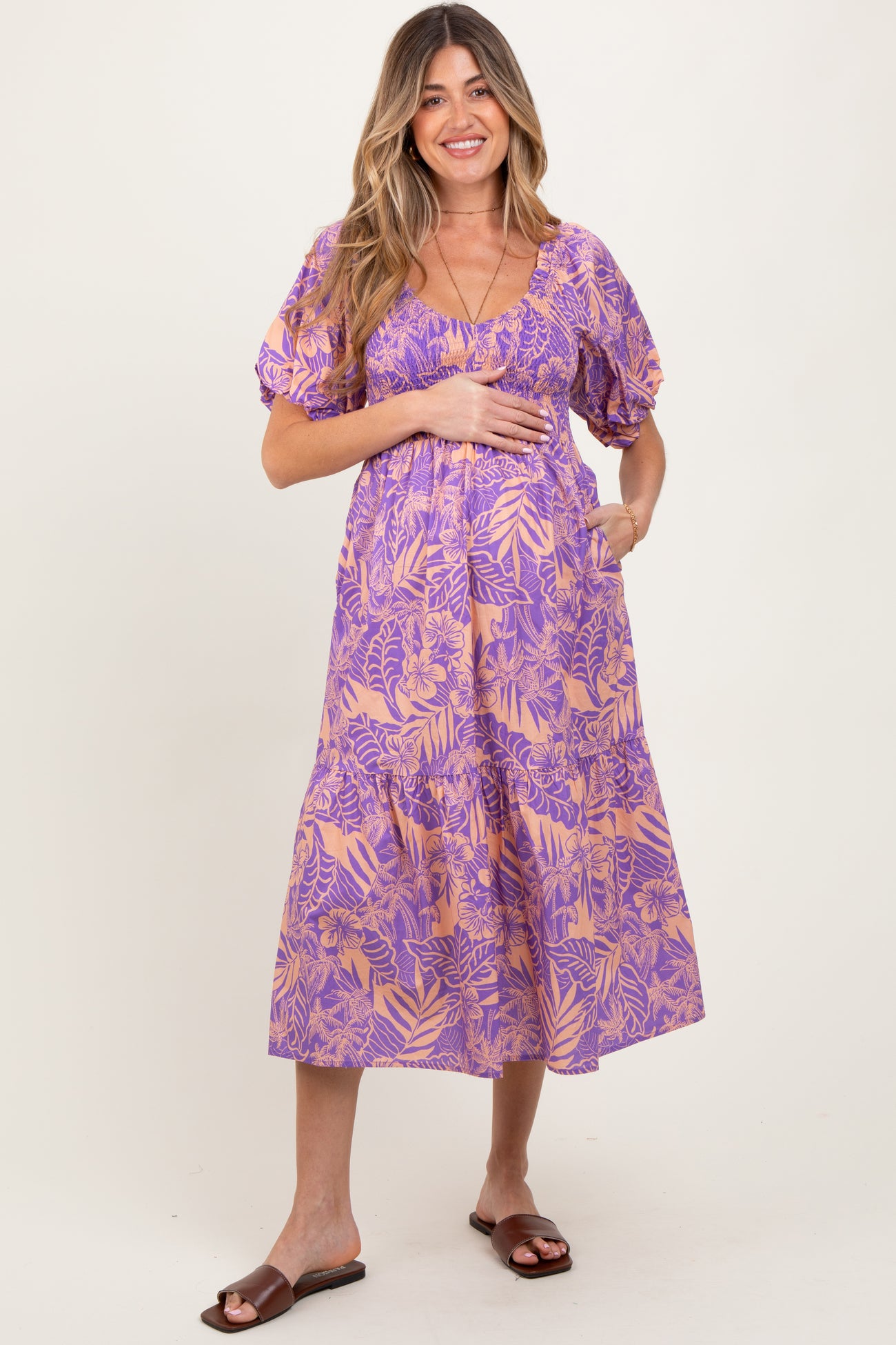 Peach Tropical Floral Smocked Tie Back Maternity Maxi Dress