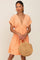 A solid dress featuring a deep v-neckline, a back cutout with a button closure, a tiered skirt, short sleeves and a ruffle hem. Skirt is double lined.