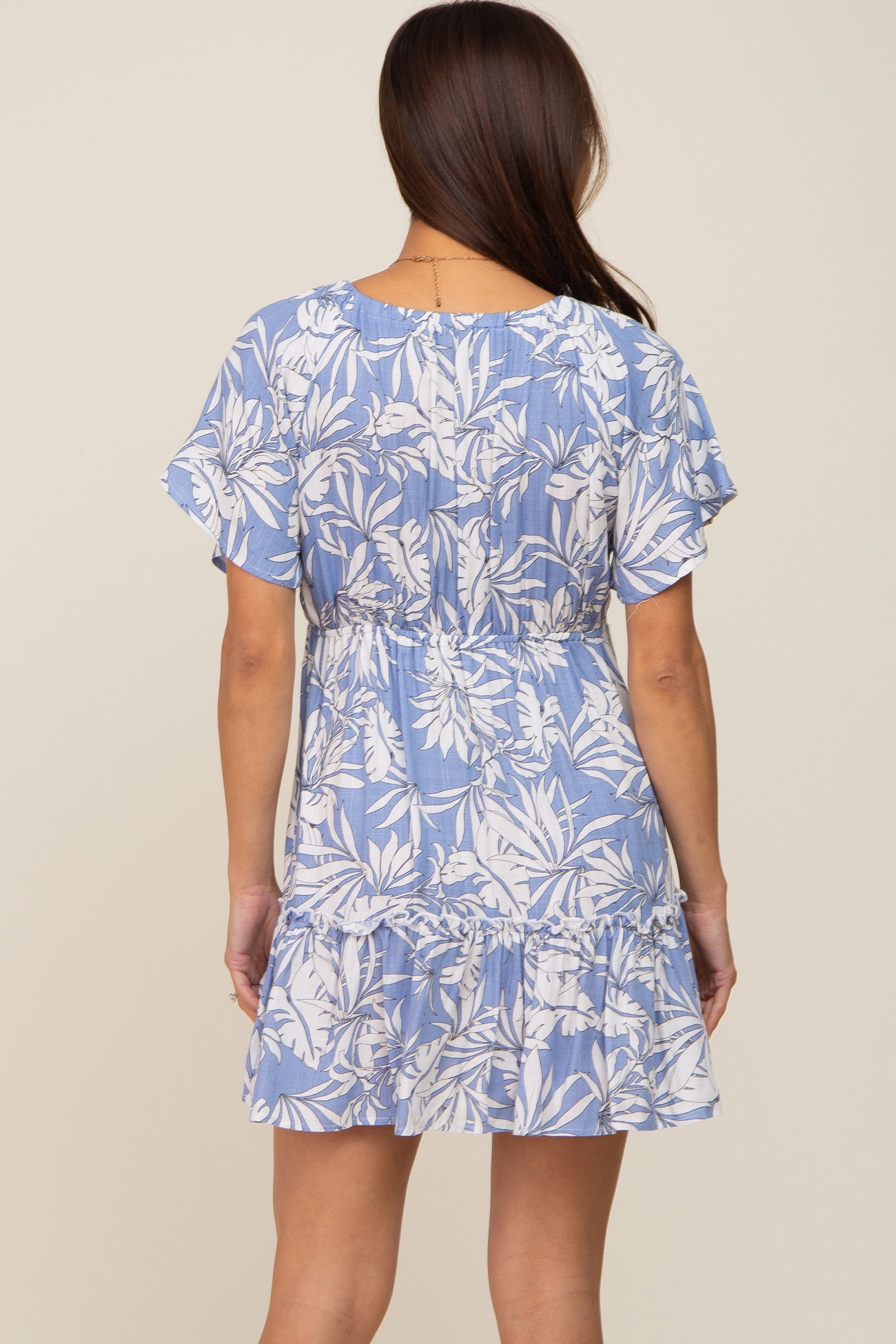Periwinkle Palm Print Short Sleeve Ruffle Maternity Dress