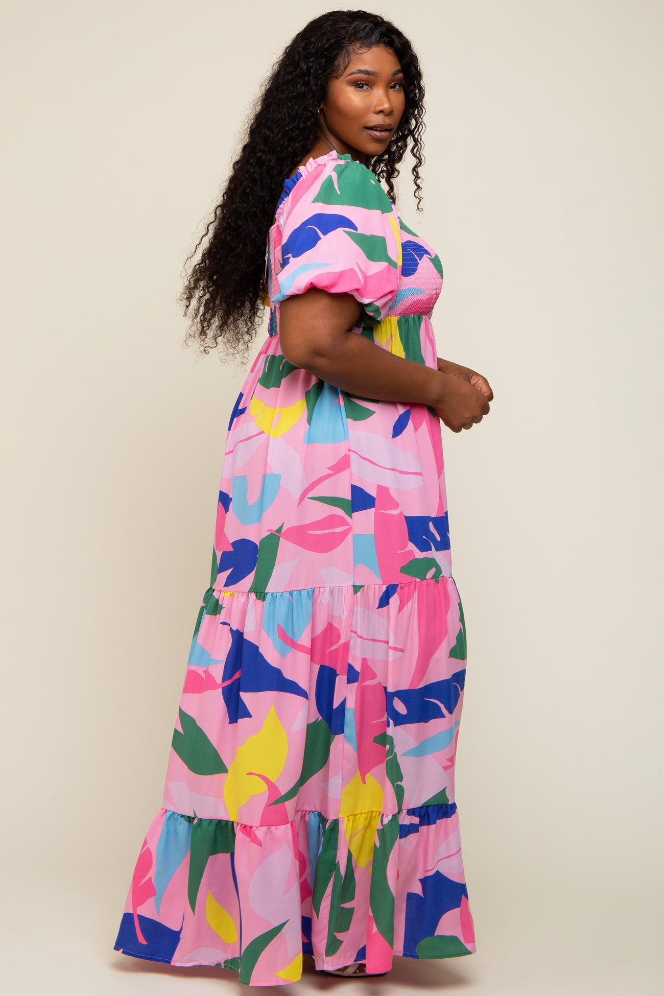 Pink Abstract Print Puff Sleeve Plus Maxi Dress