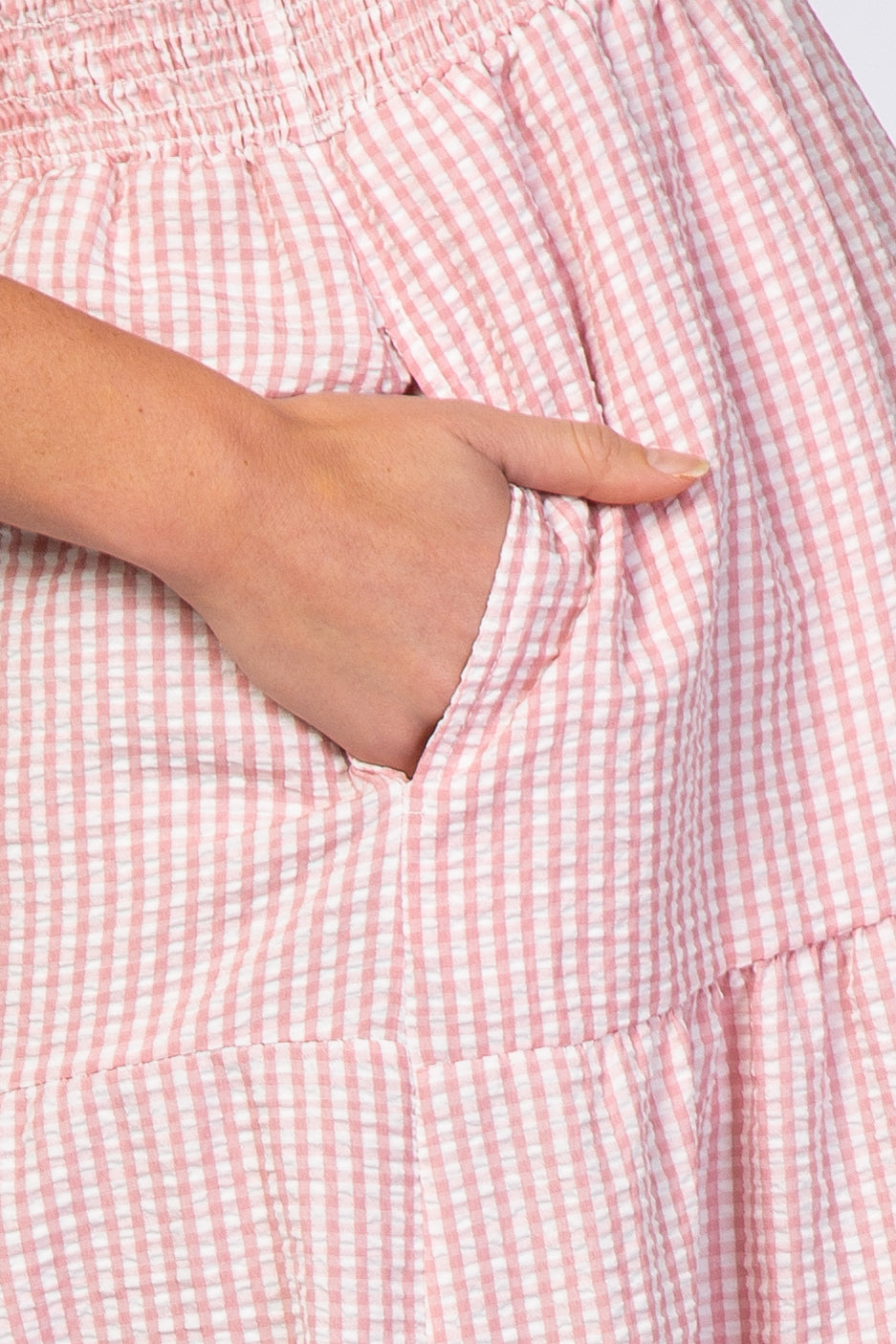 A checkered maternity midi dress featuring a smocked bust, a tiered body, side pockets and a self-tie straps.