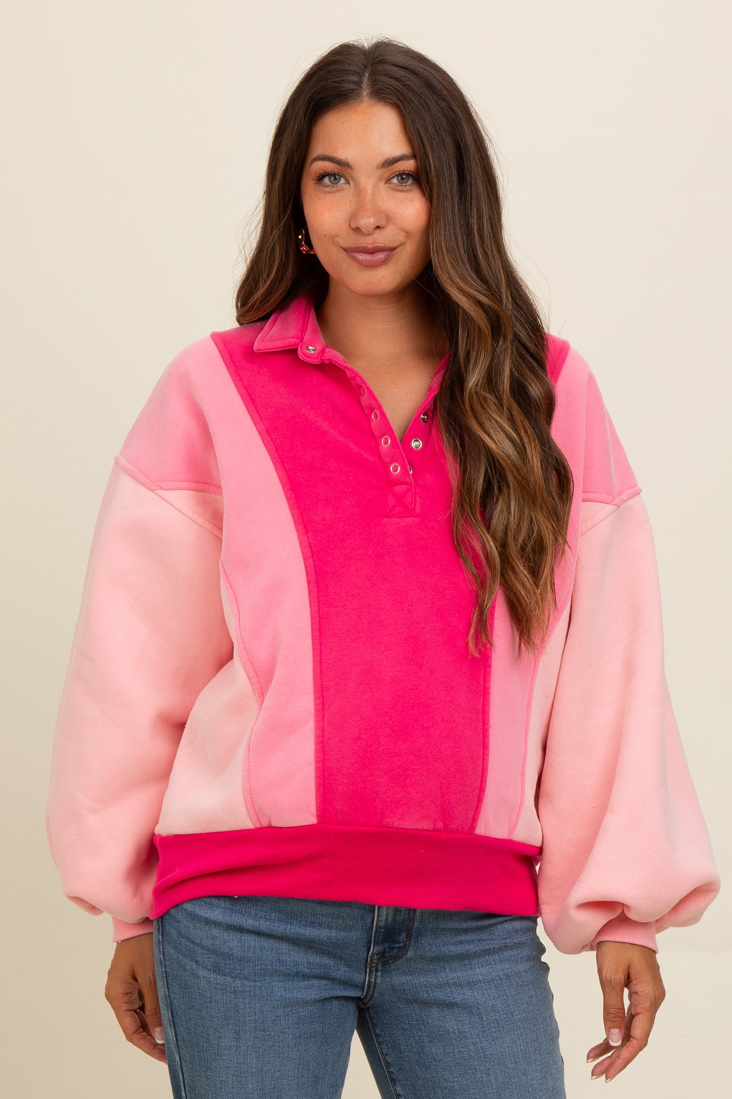 Pink Colorblock Snap Button Maternity Polo Sweatshirt