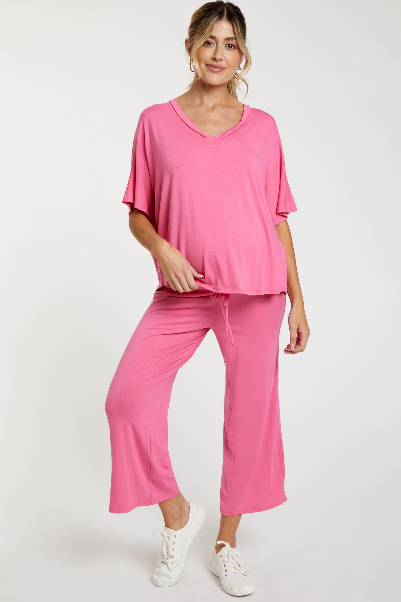 A basic set with cropped pants featuring an elastic smocked waistband. A short sleeve tee with a v-neckline.