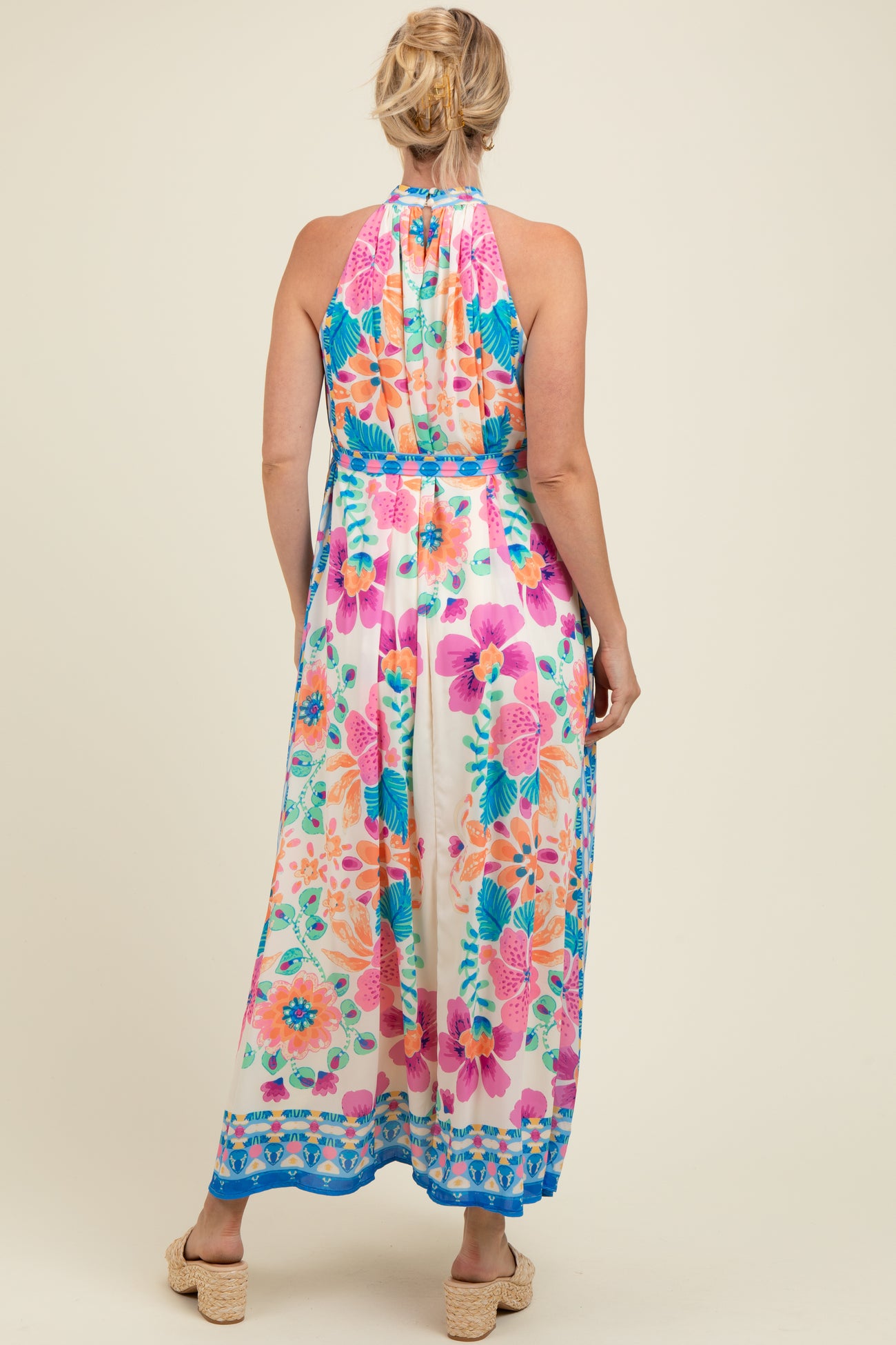 Pink Floral Border Print Halter Maternity Maxi Dress