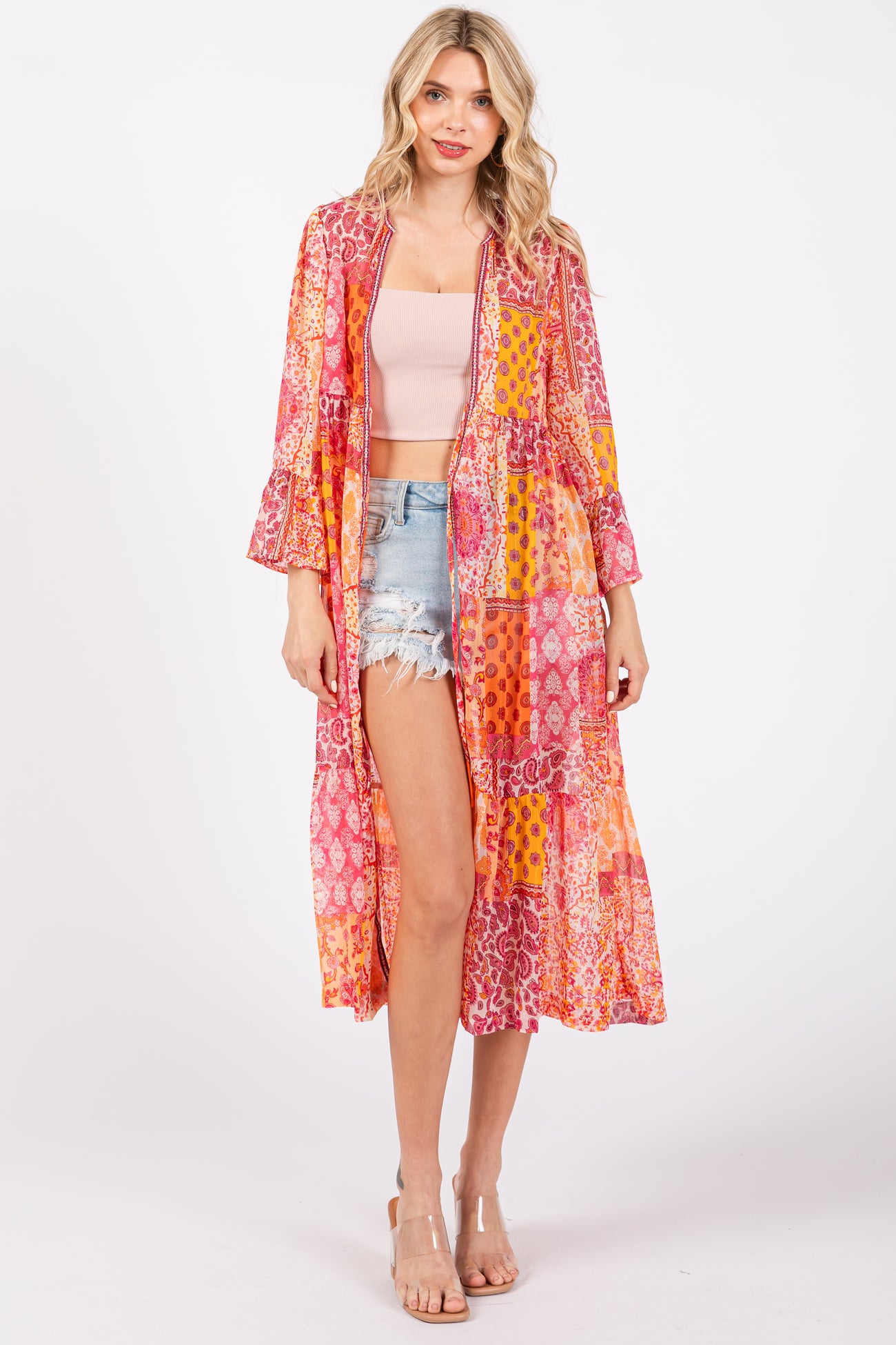 Pink Floral Paisley Metallic Striped Tie Front Cover Up
