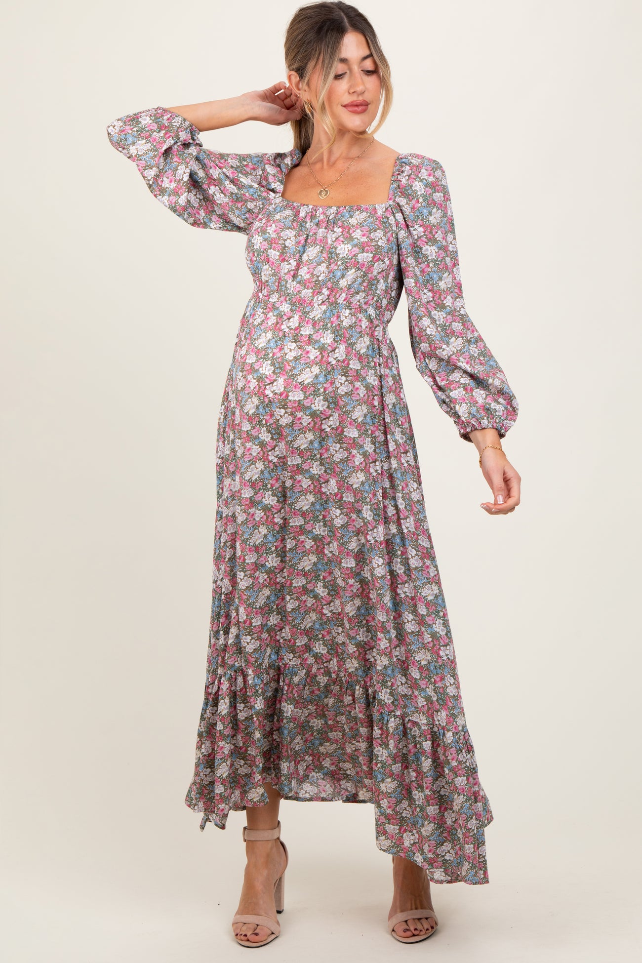 Pink Floral Reversible Long Sleeve Maternity Maxi Dress