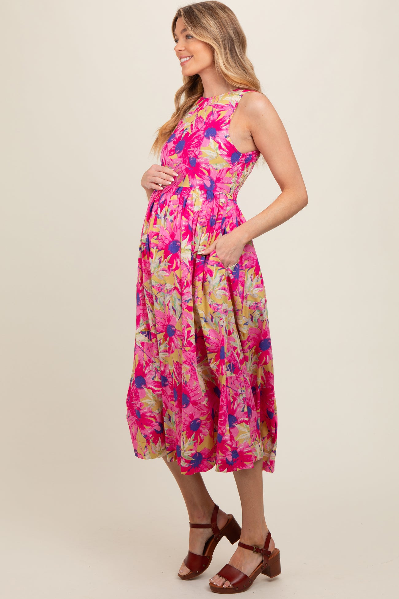 Pink Floral Sleeveless Smocked Back A-Line Maternity Midi Dress