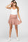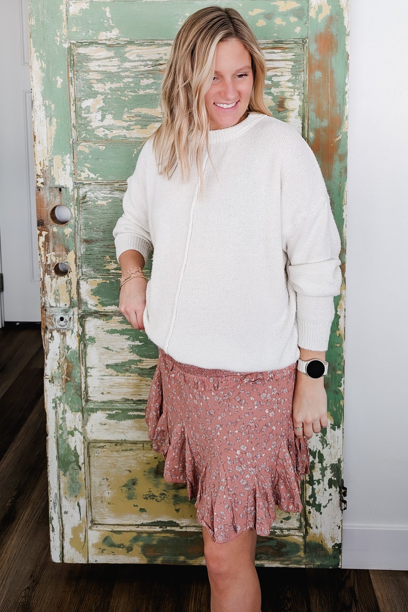 A floral maternity mini skirt featuring a smocked waist and ruffle accents. Short style lining.