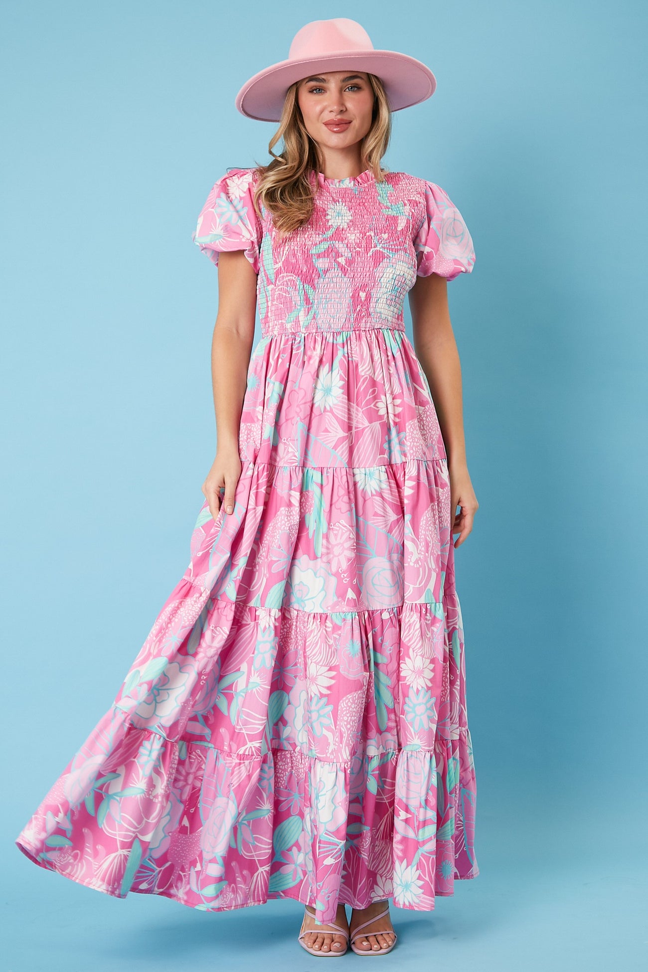 Pink Floral Smocked Short Puff Sleeve Tiered Maxi Dress