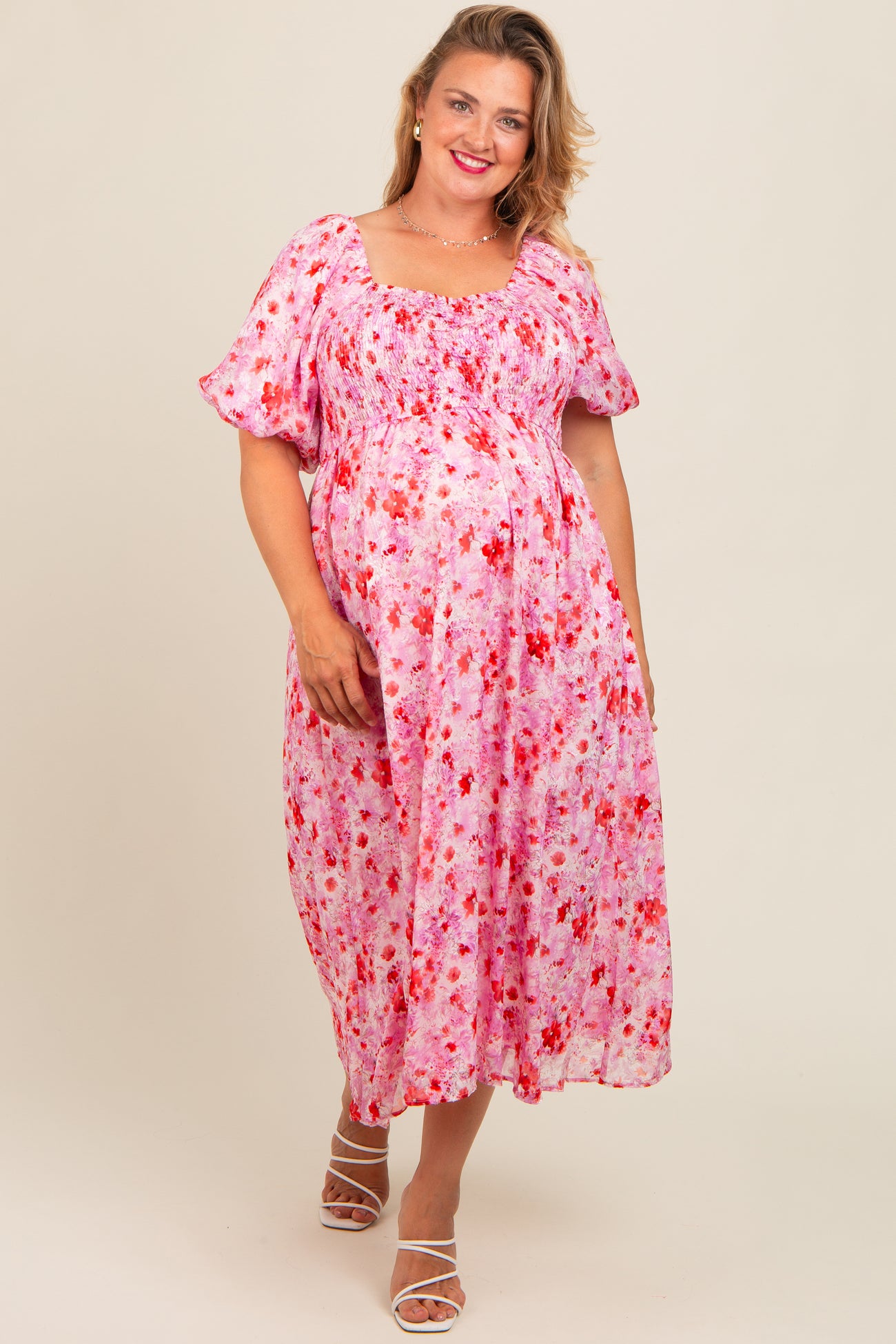 Pink Floral Smocked Sweetheart Neck Short Puff Sleeve Maternity Plus Midi Dress