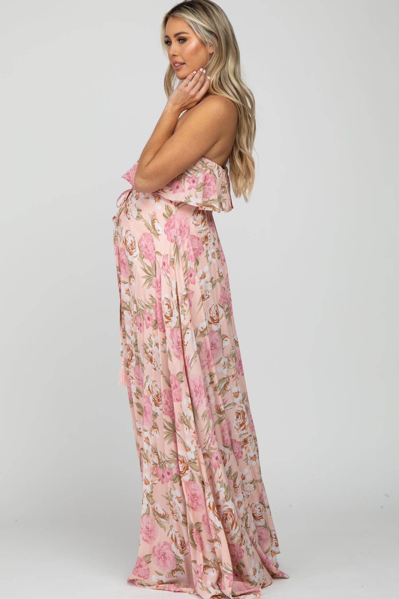 Pink Floral Strapless Ruffle Front Maternity Maxi Dress