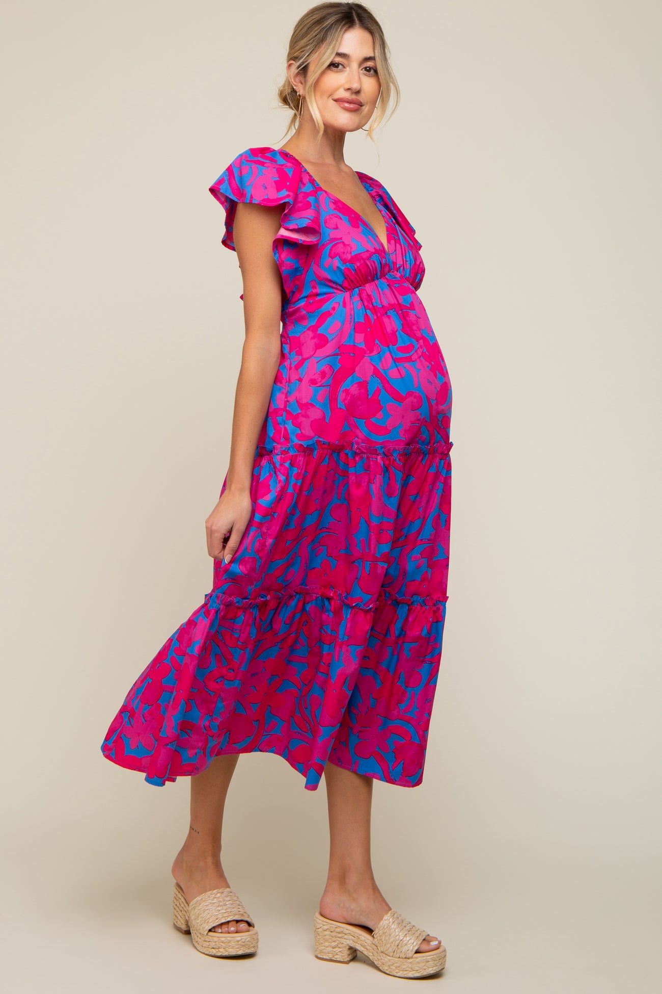 A printed maternity maternity midi dress featuring a deep v-neckline, short flutter sleeves, an open back with adjustable lace up strings, side pockets and a tiered skirt.