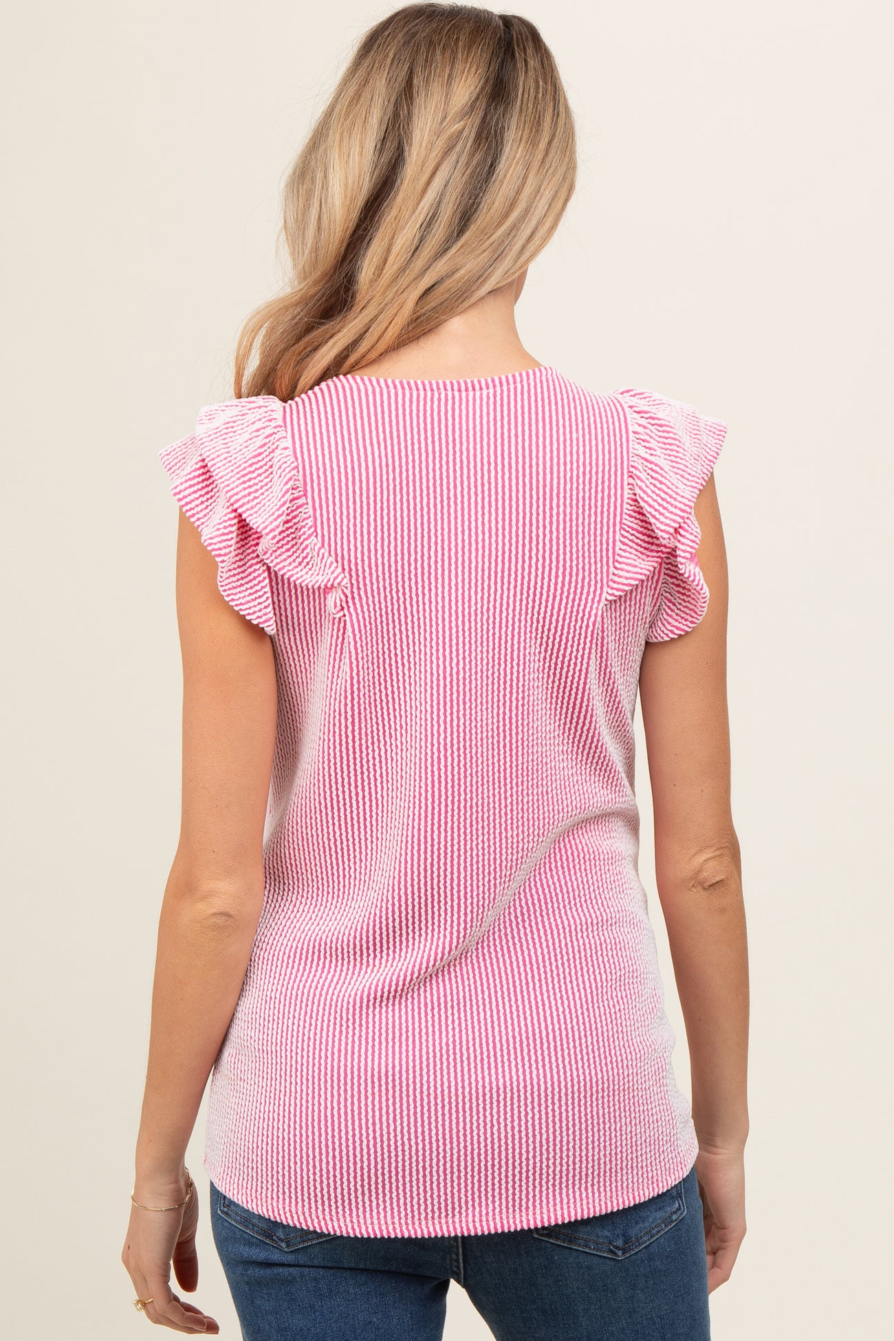 A solid ribbed maternity top with ruffle sleeves and rounded hem.