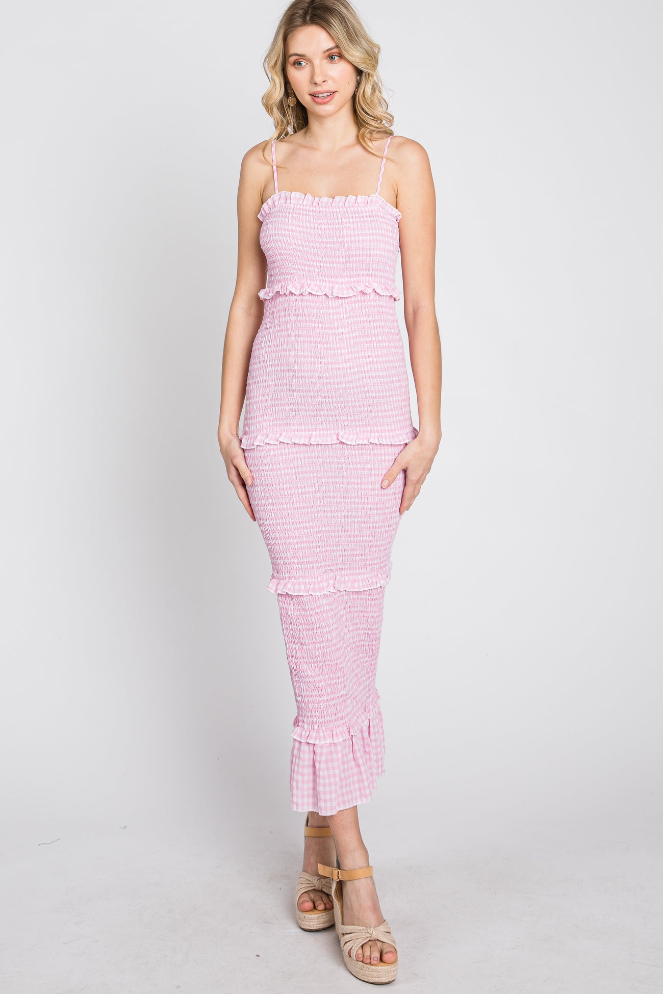 Pink Gingham Print Smocked Maxi Dress