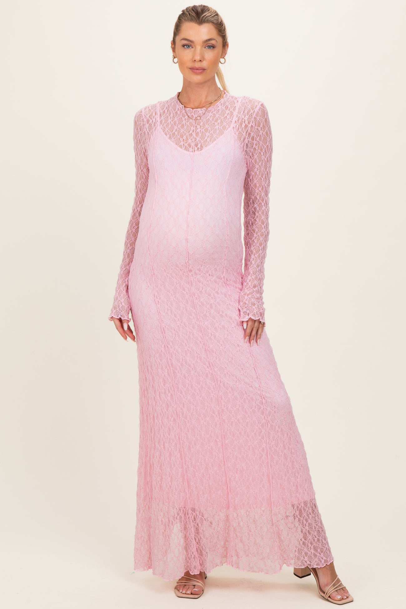 Pink Lace Mock Neck Long Sleeve Maternity Maxi Dress