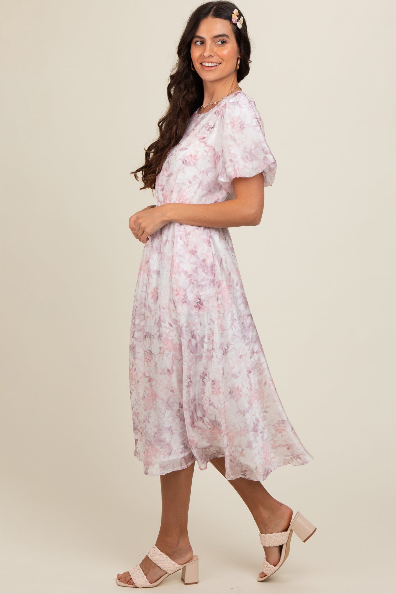 Pink Lavender Floral Puff Sleeve Maternity Dress