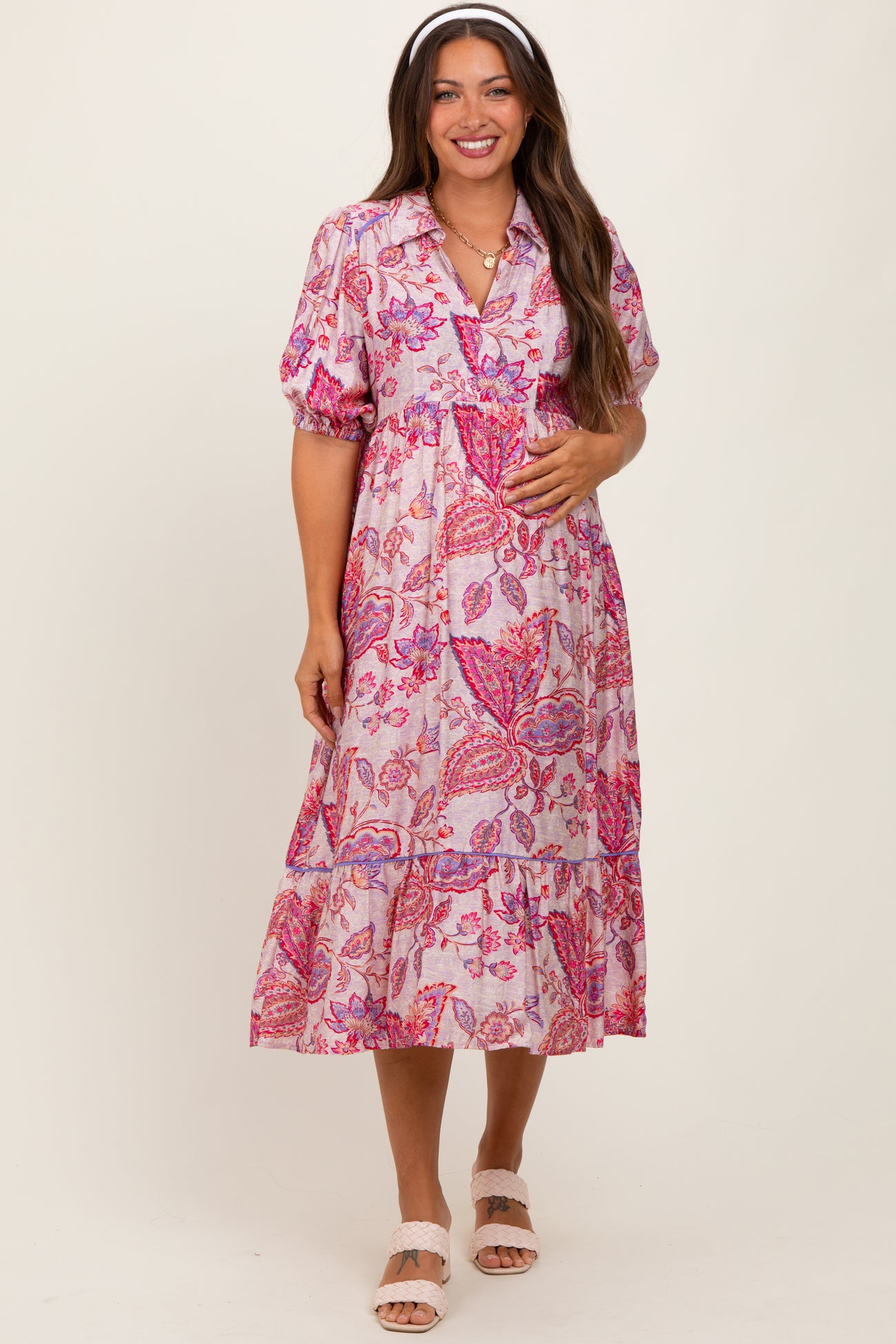 Pink Paisley Collared Ruffle Hem Maternity Midi Dress