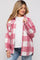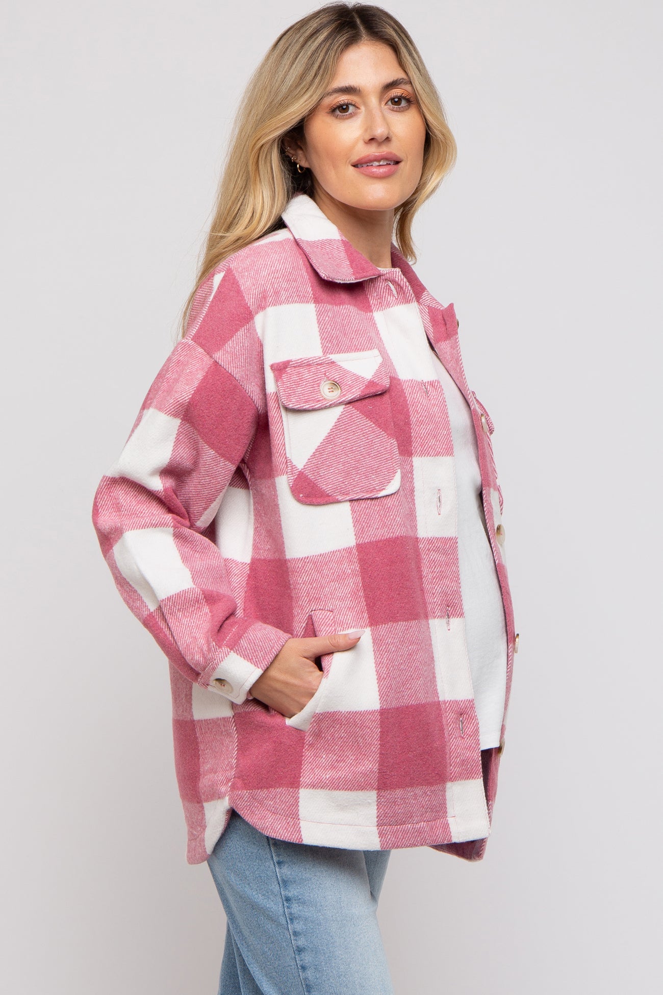 A long plaid maternity shirt jacket featuring a soft brushed material, a collar, long sleeves, front functioning buttons, two front pockets and two side pockets.
