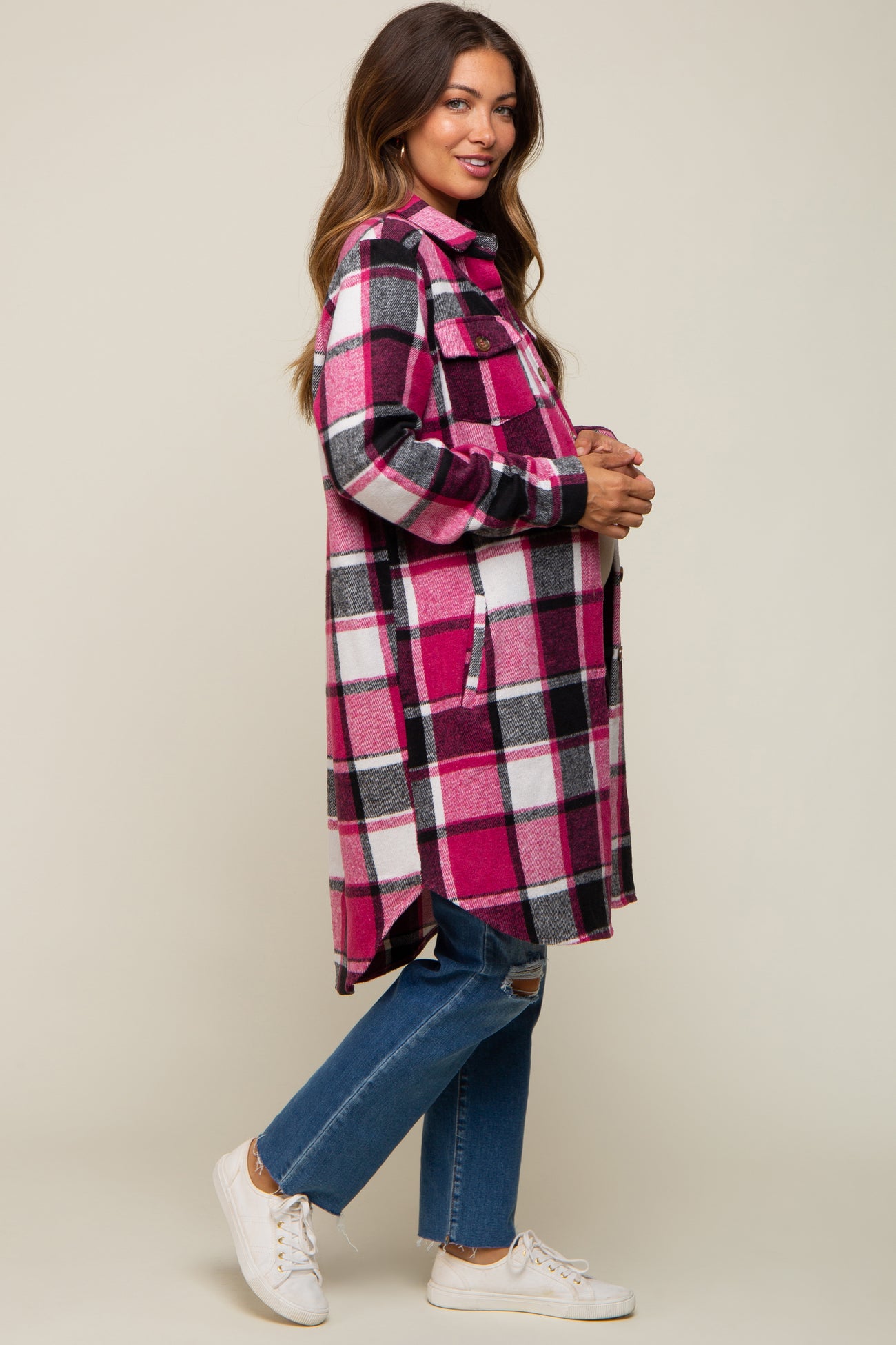 A plaid print maternity long shirt jacket with a collared neckline, button front closure, two front chest pockets and two side pockets.