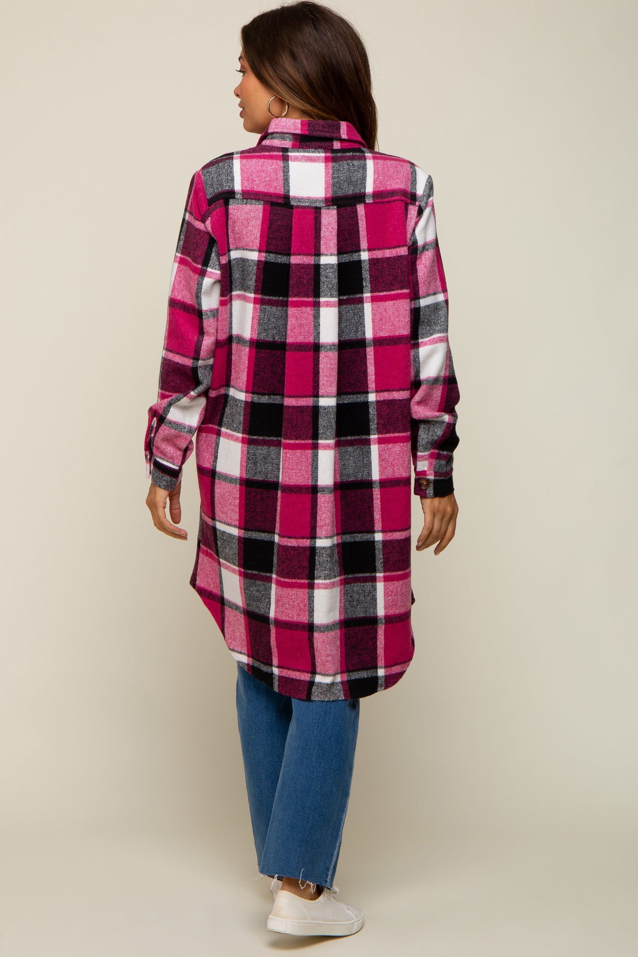Pink Plaid Fleece Maternity Long Shirt Jacket