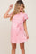 A pleated maternity dress with a rounded neckline, short flounce sleeves, a waist tie, and a back keyhole button closure.