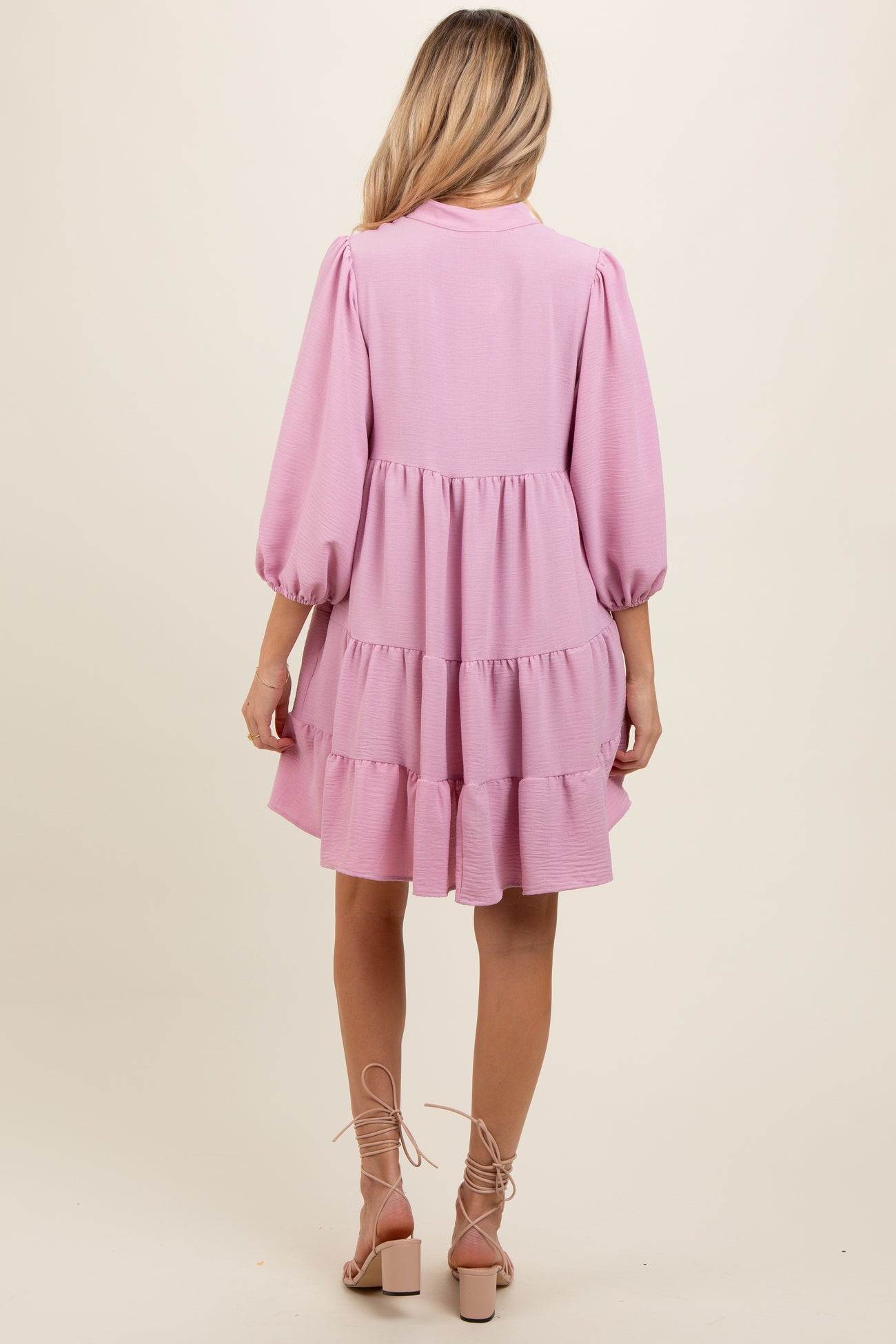 Details A maternity dress featuring a pleated front, a tie at the neck, a tiered skirt, side pockets and 3/4 length puff sleeves. Content + Care