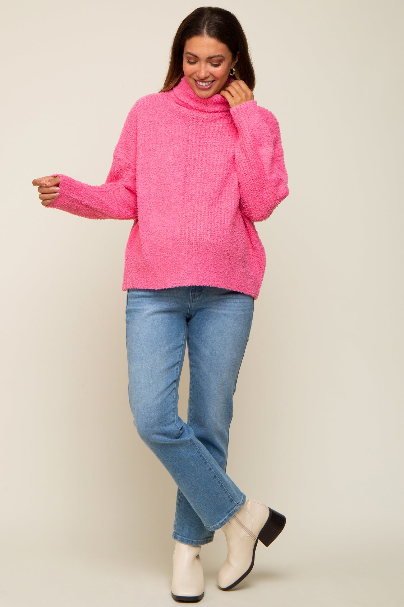 Pink Ribbed Boucle Knit Turtleneck Maternity Sweater