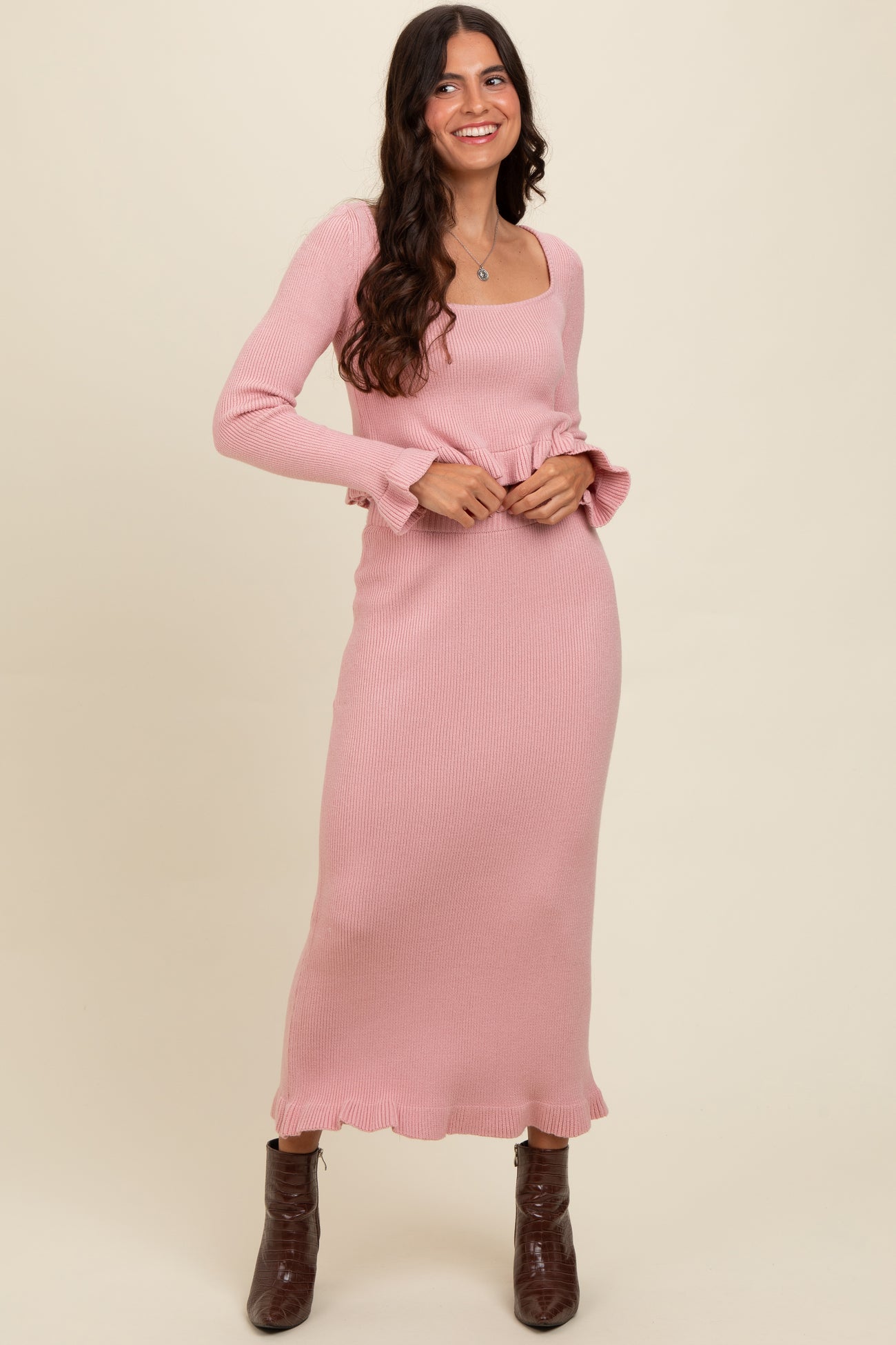 Pink Ruffle Hem Knit Top And Midi Skirt Maternity Set